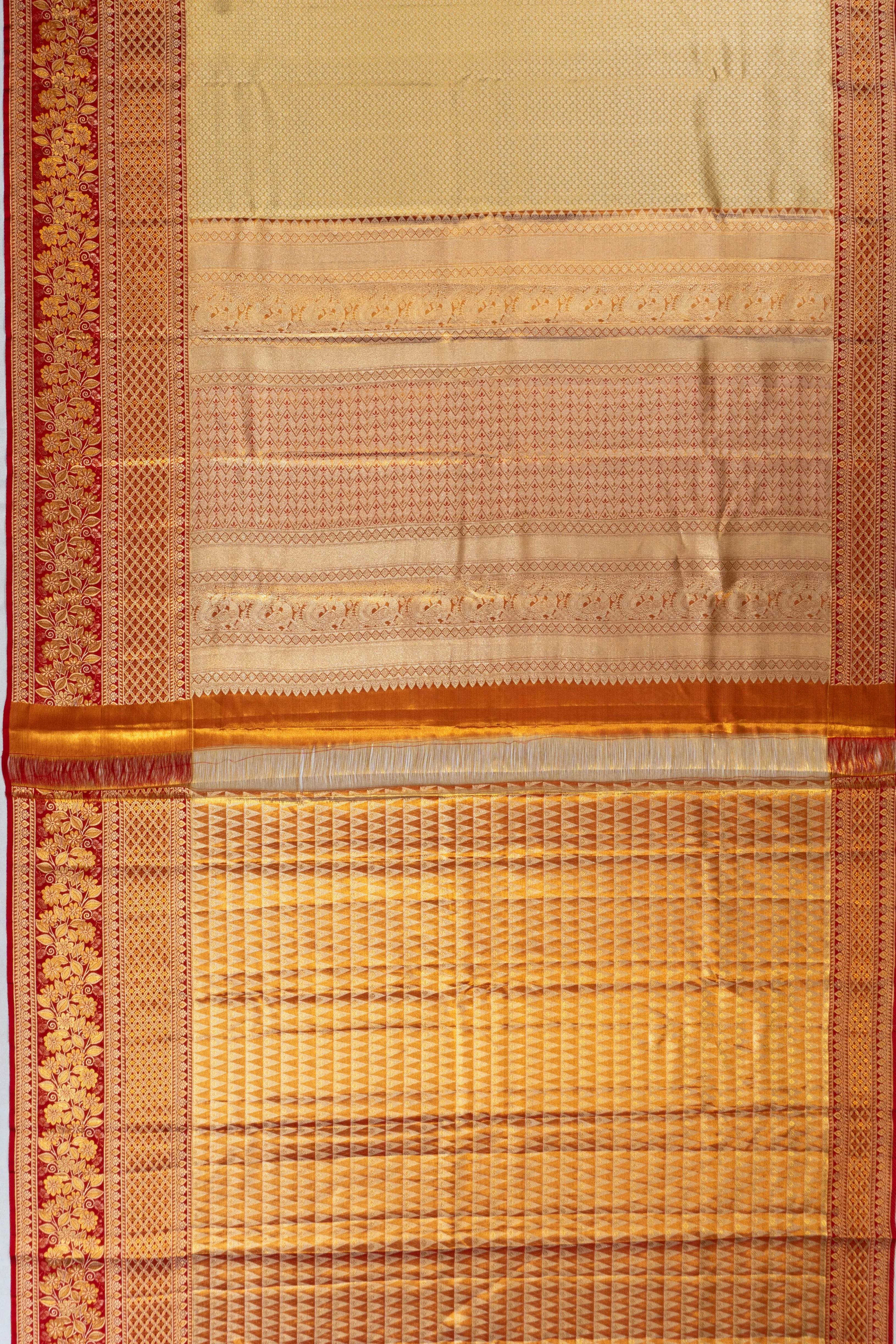 The saree's red medium border stands out in a striking contrast, adorned with gold and silver zari brocade, featuring intricate floral vines that speak to its artisanal craftsmanship