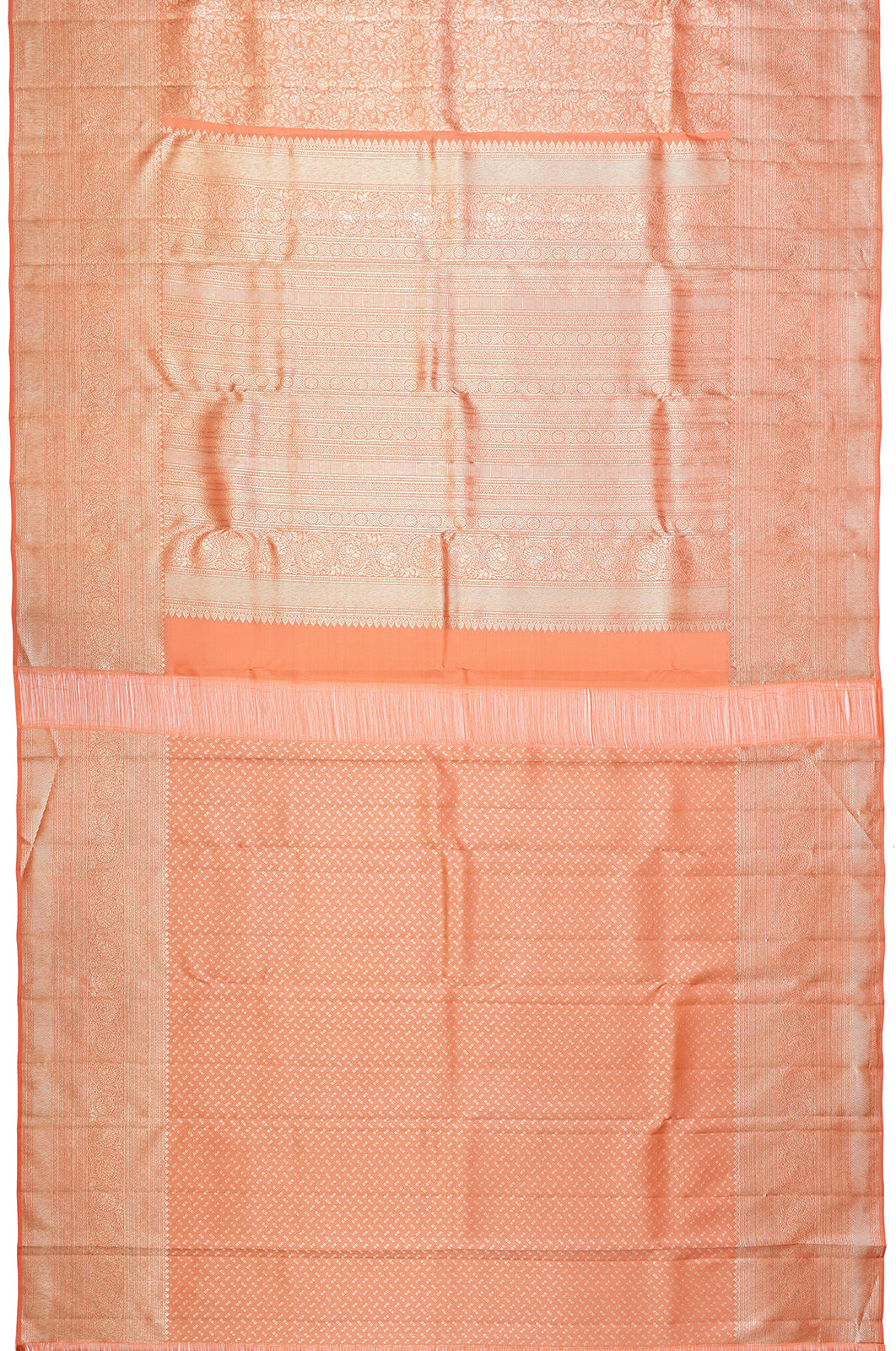 This exquisite piece showcases a silver zari floral brocade, lending a touch of opulence to its vibrant orange hue