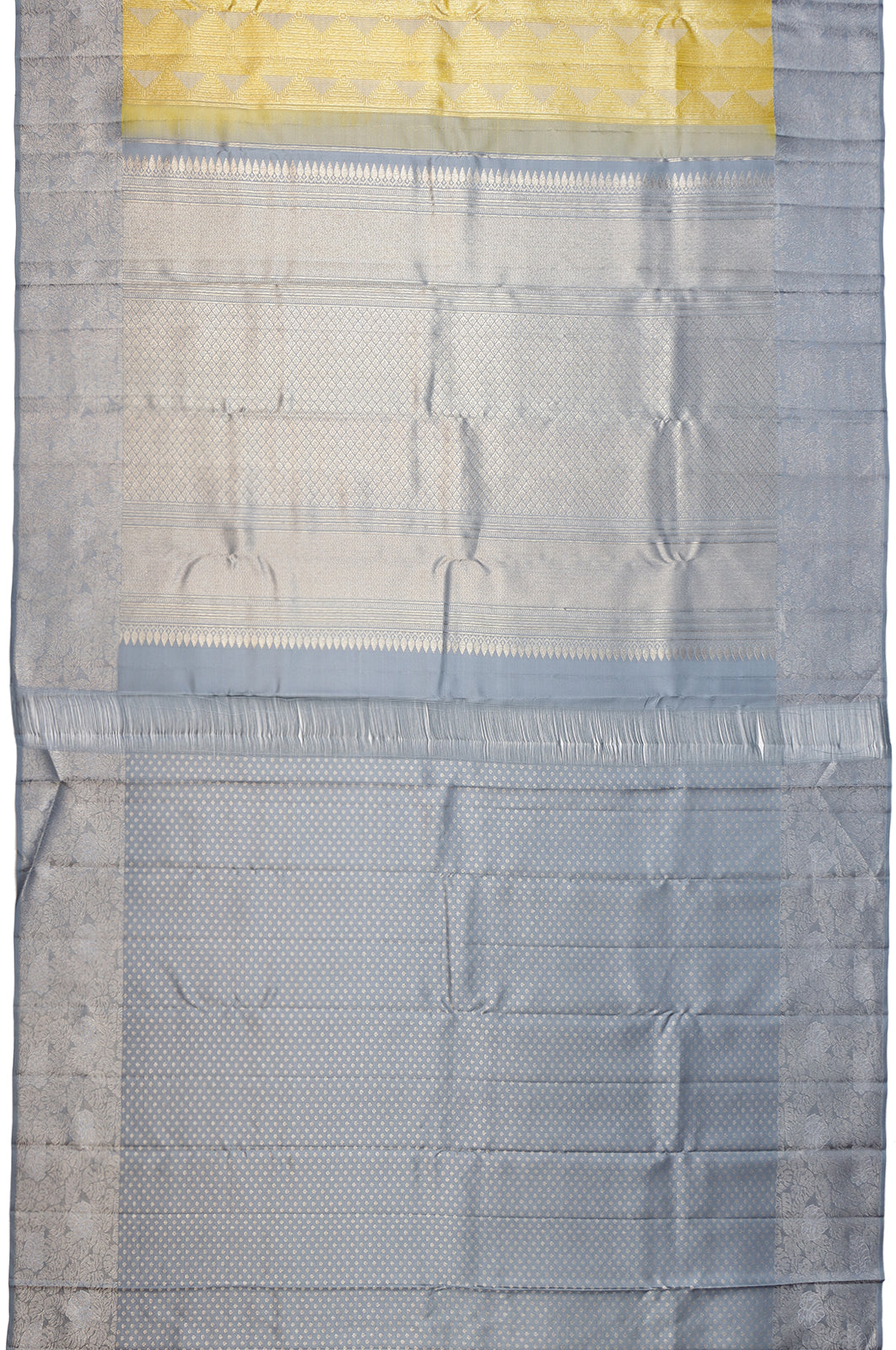 A contrasting grey border, woven with gold zari floral brocade, frames the saree beautifully, adding a touch of refined sophistication