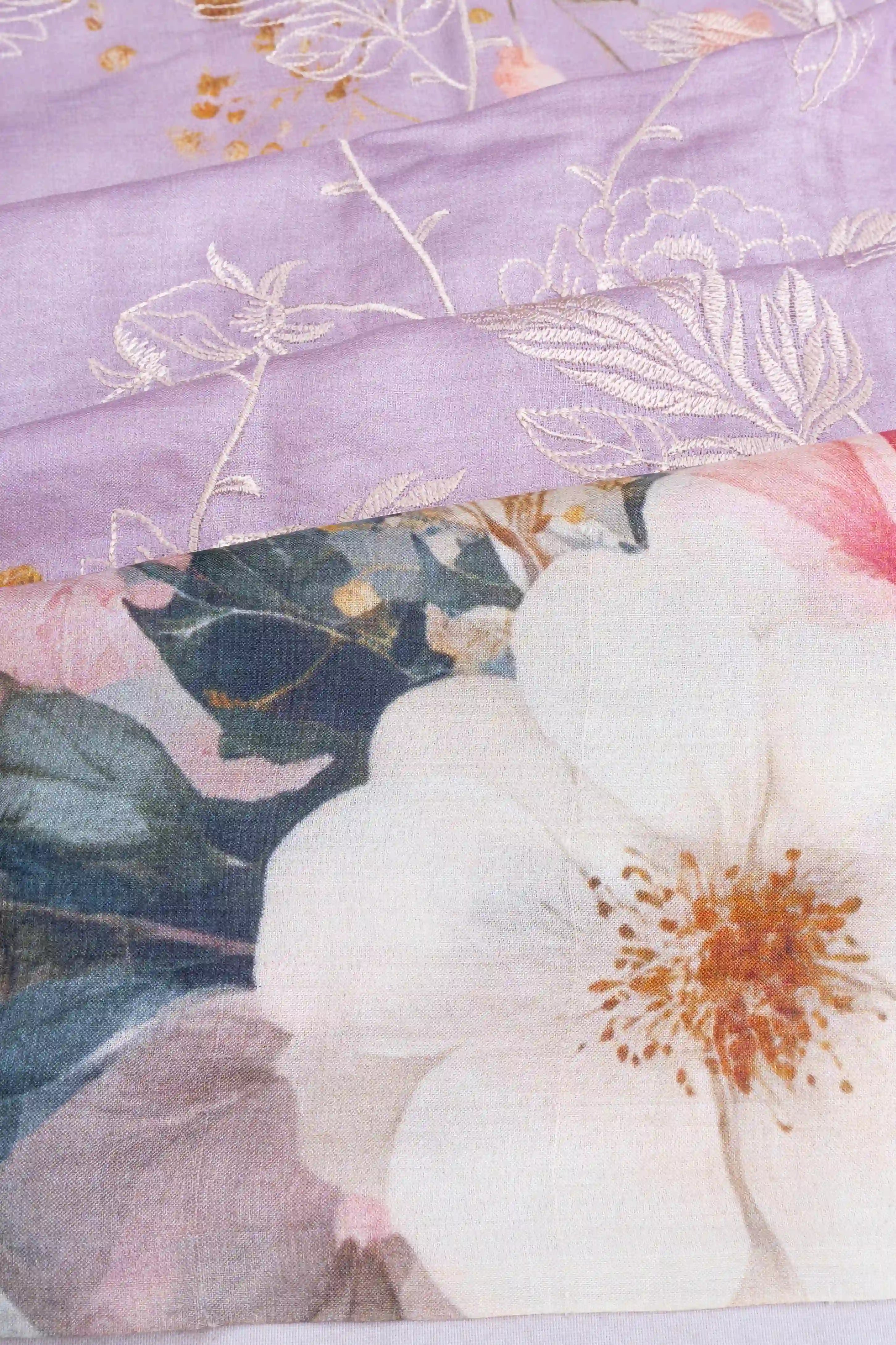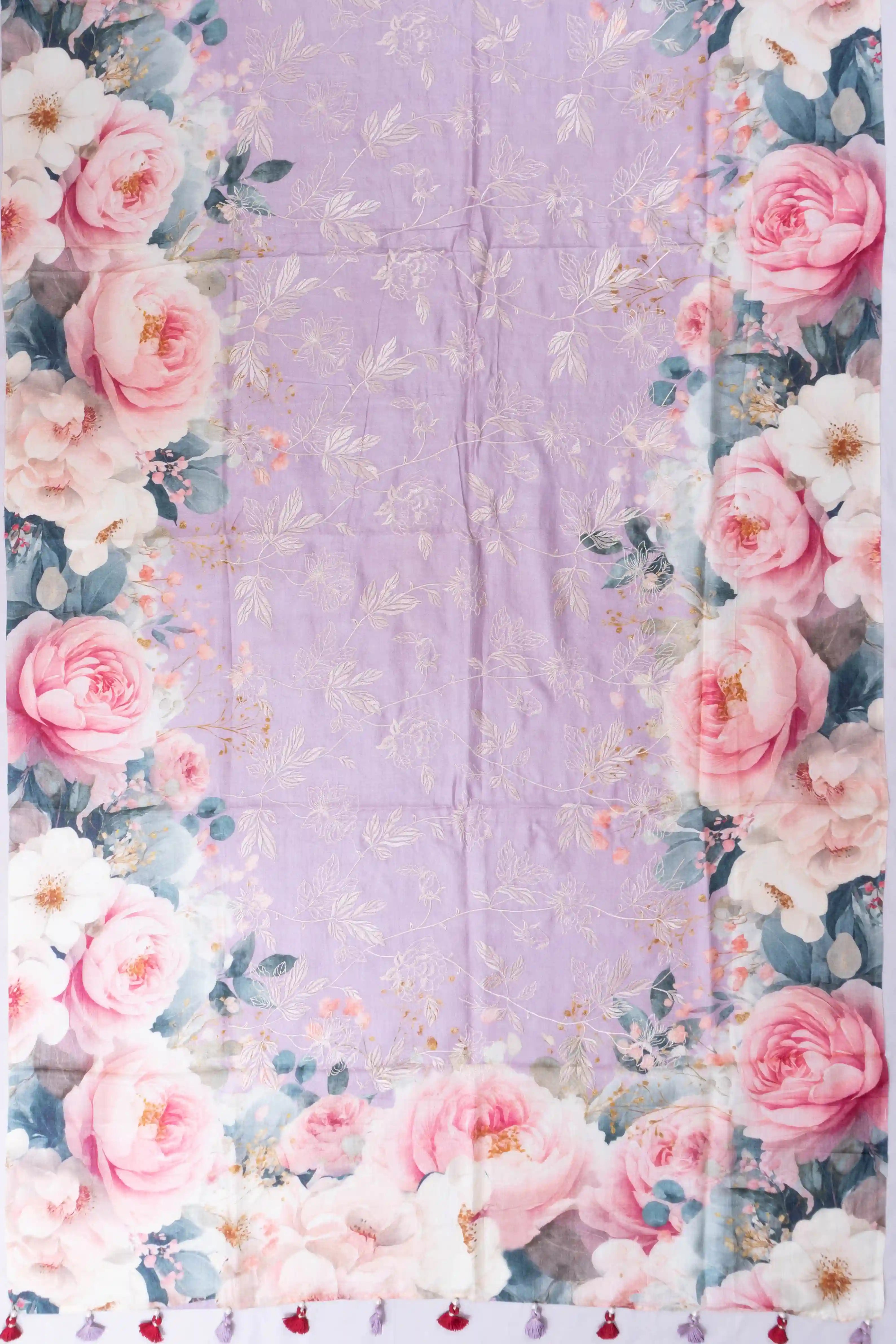The saree is enhanced by a striking cream border, featuring a bold floral print that offers a harmonious contrast to the lavender hue