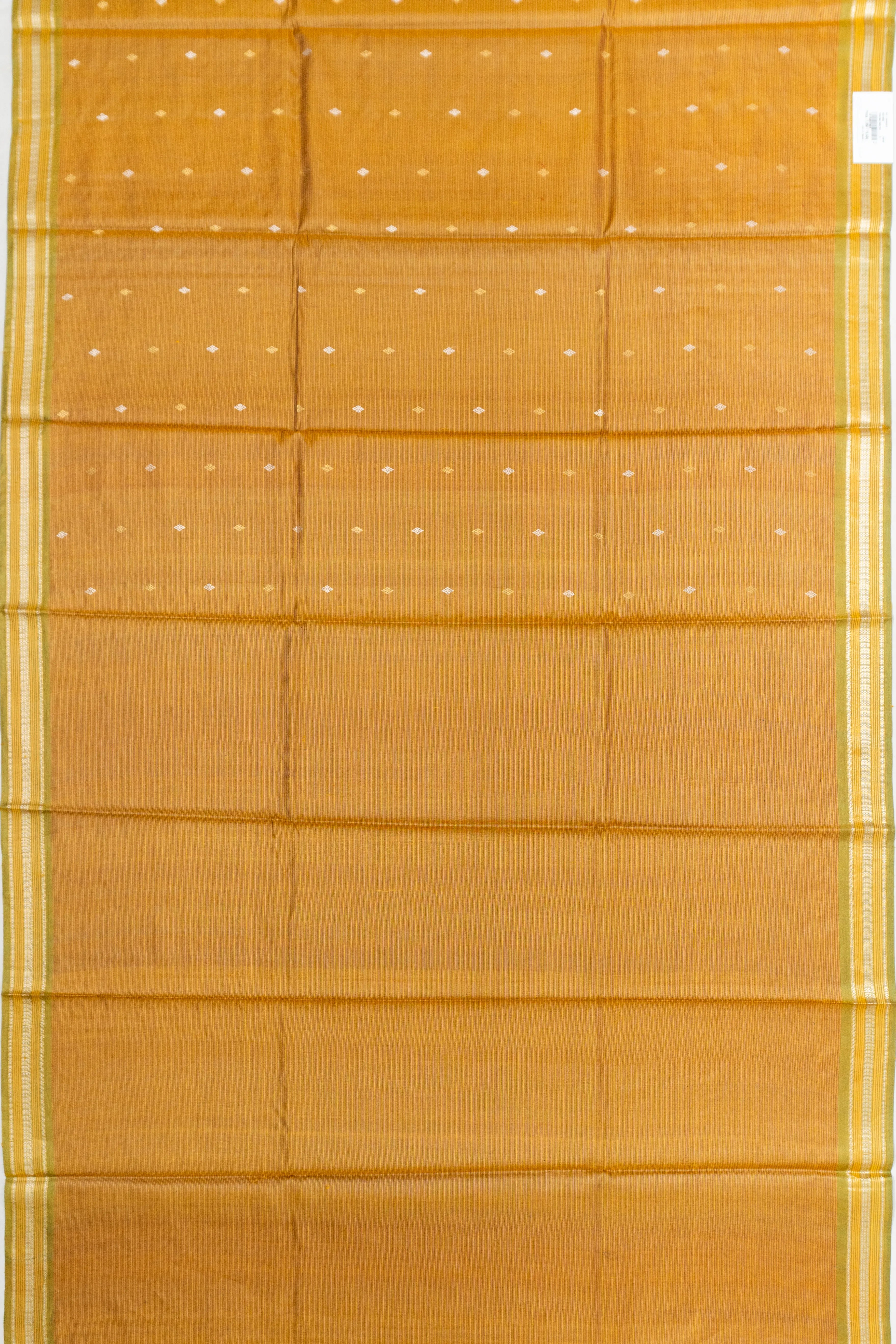 A small green border, intricately crafted with contrast gold zari brocade, frames the saree, offering an exquisite touch of sophistication