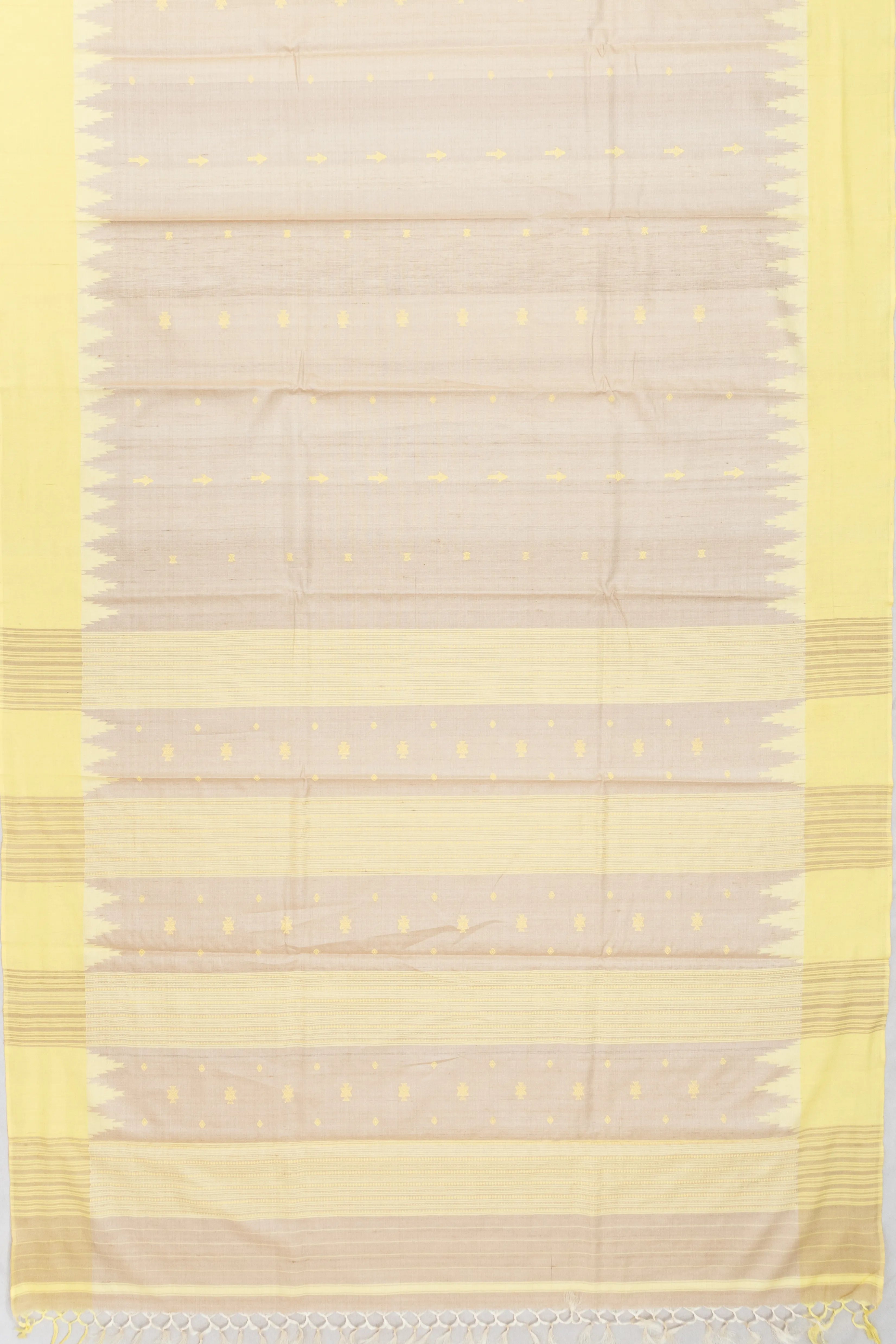 Enhancing the saree's charm is a contrast yellow plain temple small border, offering a harmonious blend that accentuates the overall design