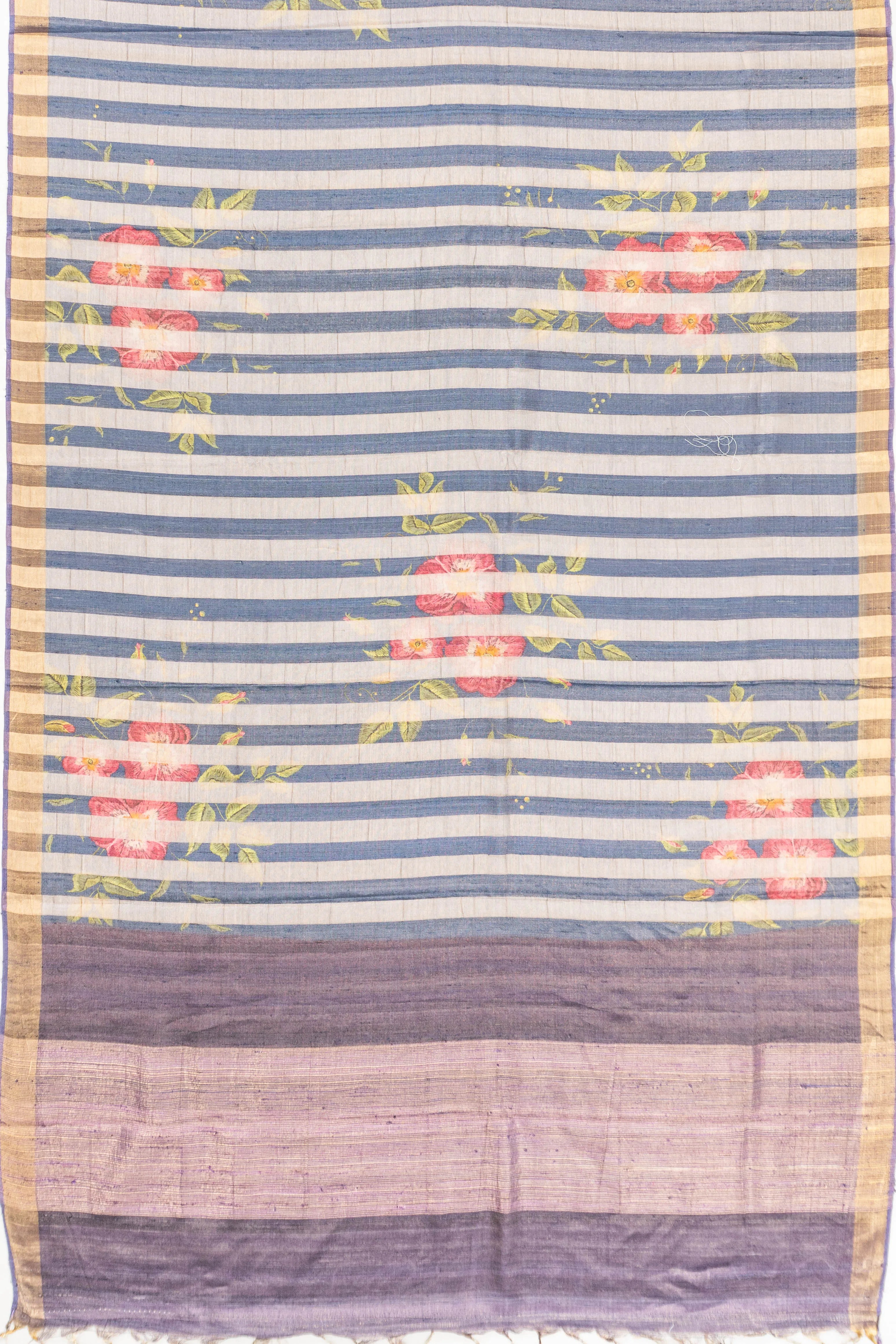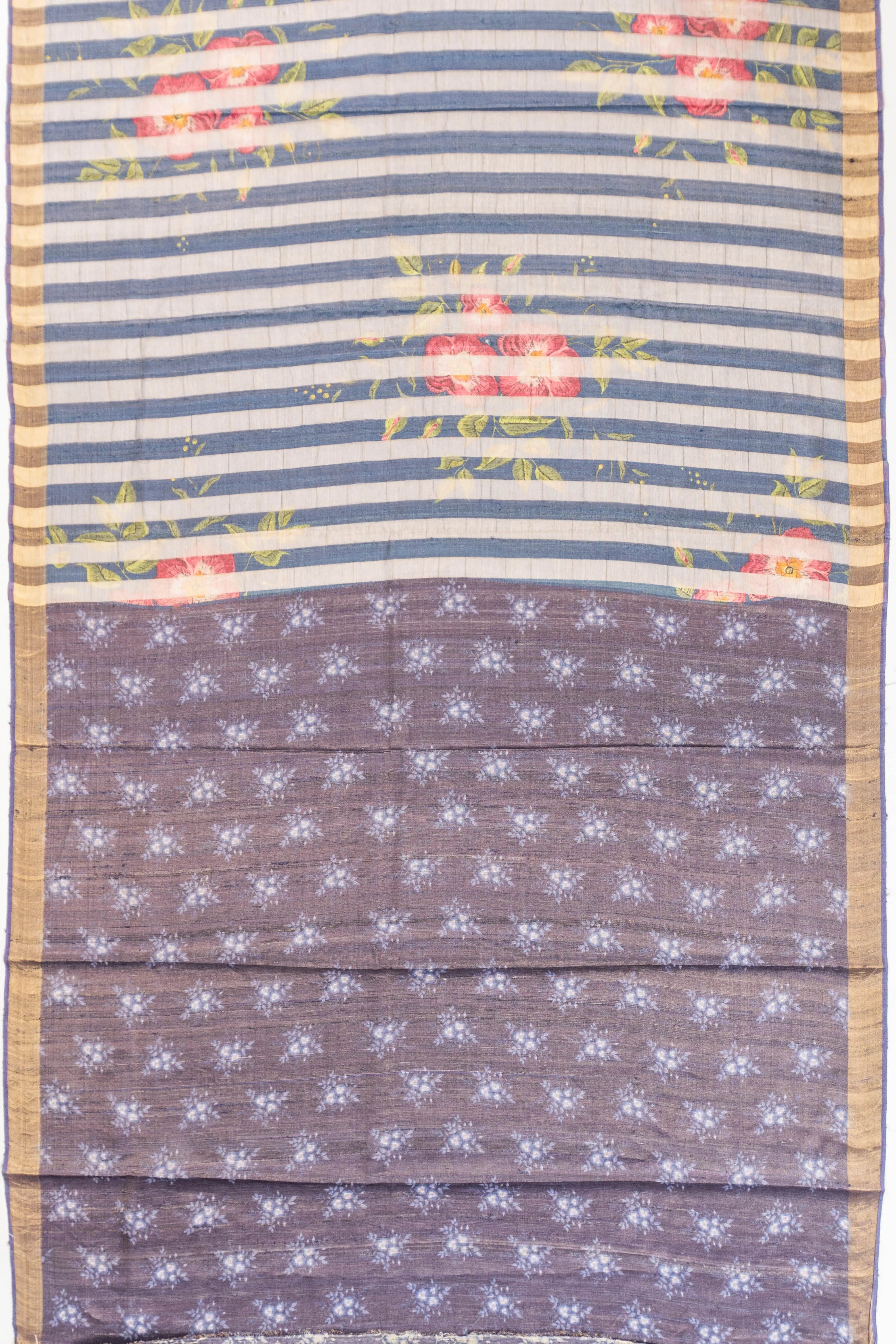 Tussar Organza Tissue Vertical Lines And Floral Printed Blue Saree