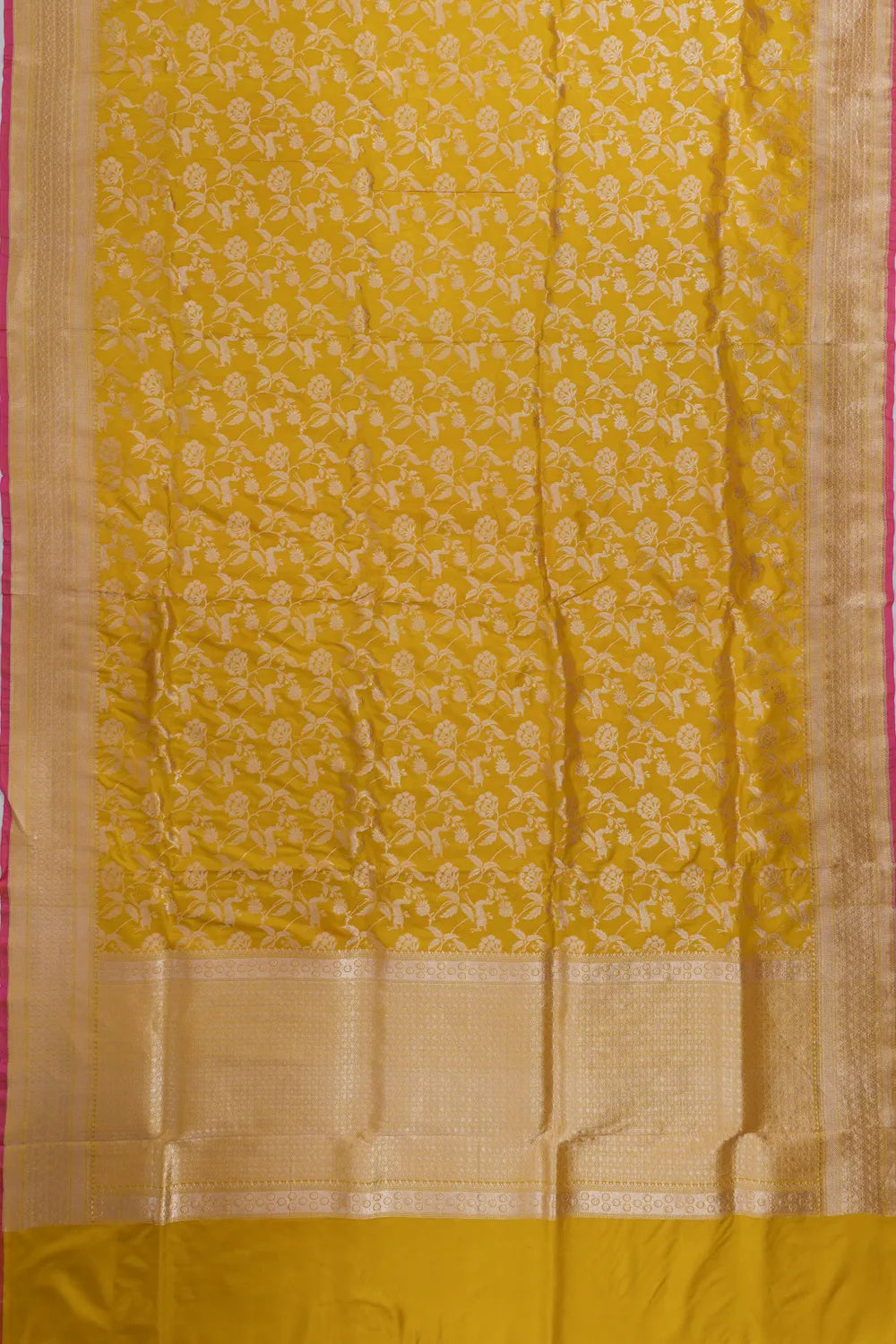 The saree's body is adorned in a vibrant yellow, radiating warmth and elegance, while the self gold zari floral brocade border adds a touch of opulence