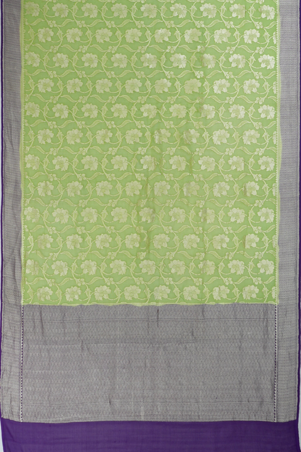 Step into a world of elegance with the Vaanya Banaras Georgette Jaal Green Saree, a delicate blend of tradition and sophistication This exquisite saree showcases a lush green body adorned with intricate jaal work, embodying the rich heritage of Banaras craftsmanship