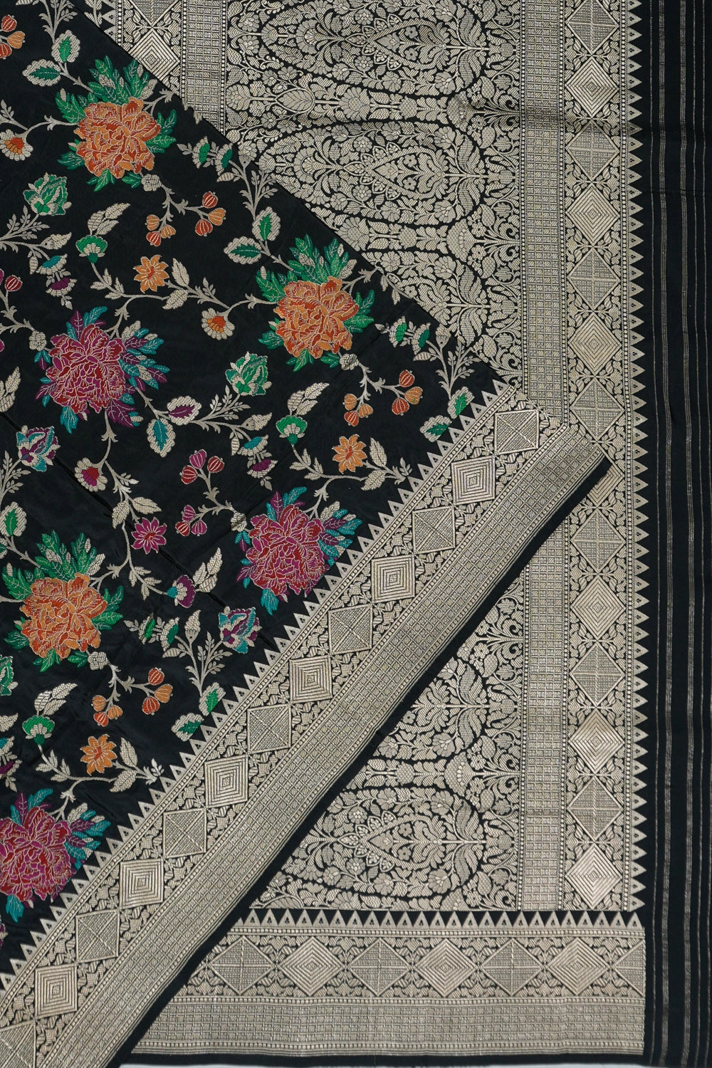 The rich black silk is adorned with delicate jaal motifs, capturing the essence of timeless elegance and intricate artistry