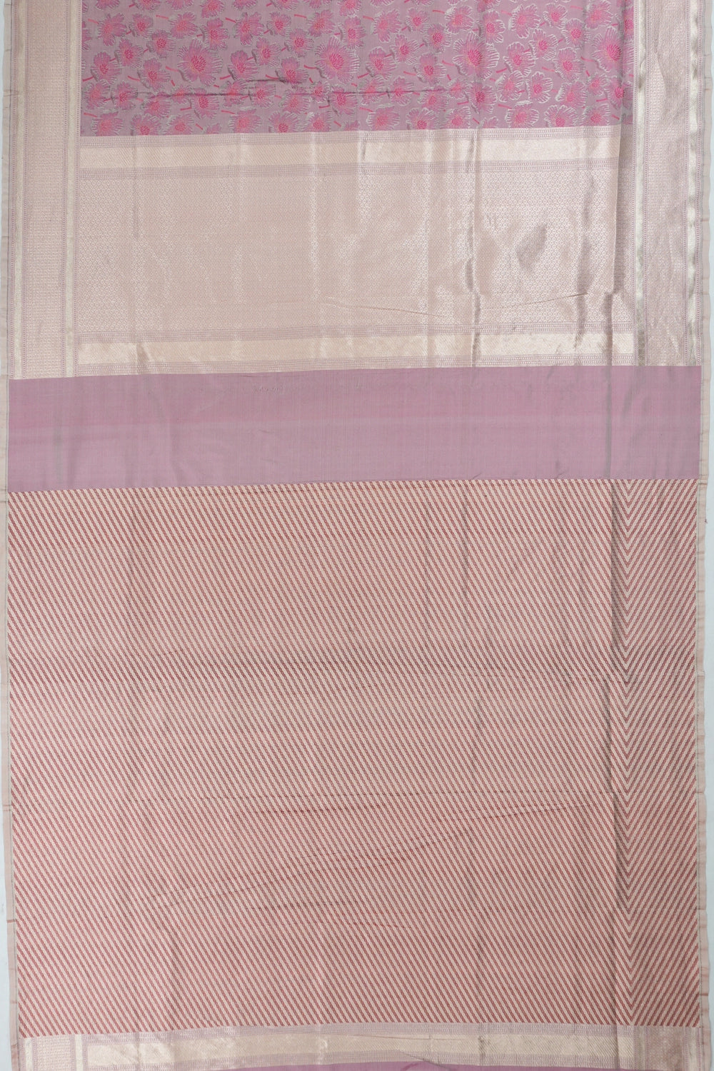 The contrast silver zari border in purple adds a touch of sophistication, creating a harmonious frame that elevates the saree's regal appeal