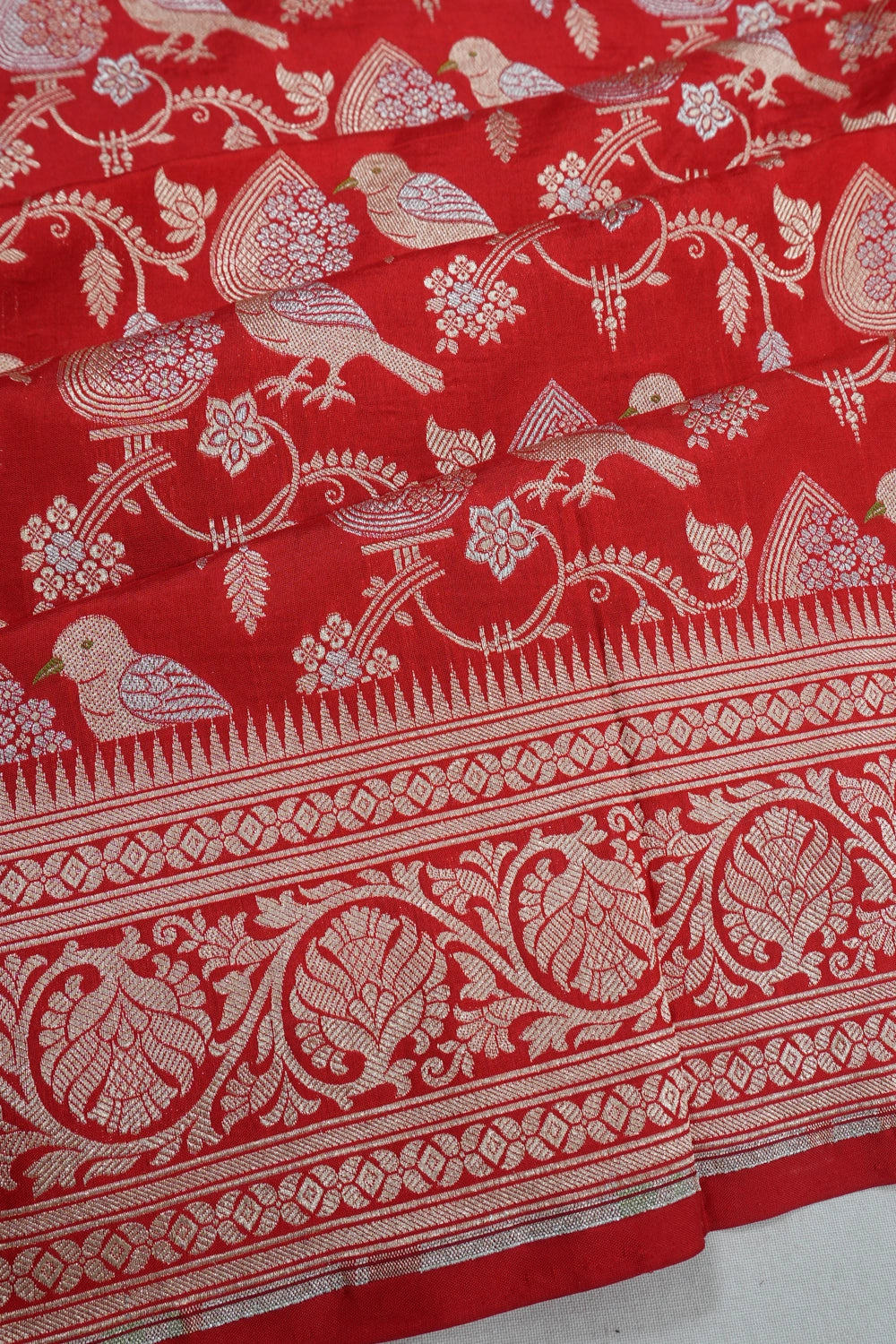 A self gold zari border enhances the saree, adding a touch of refined splendor that complements the red tones beautifully