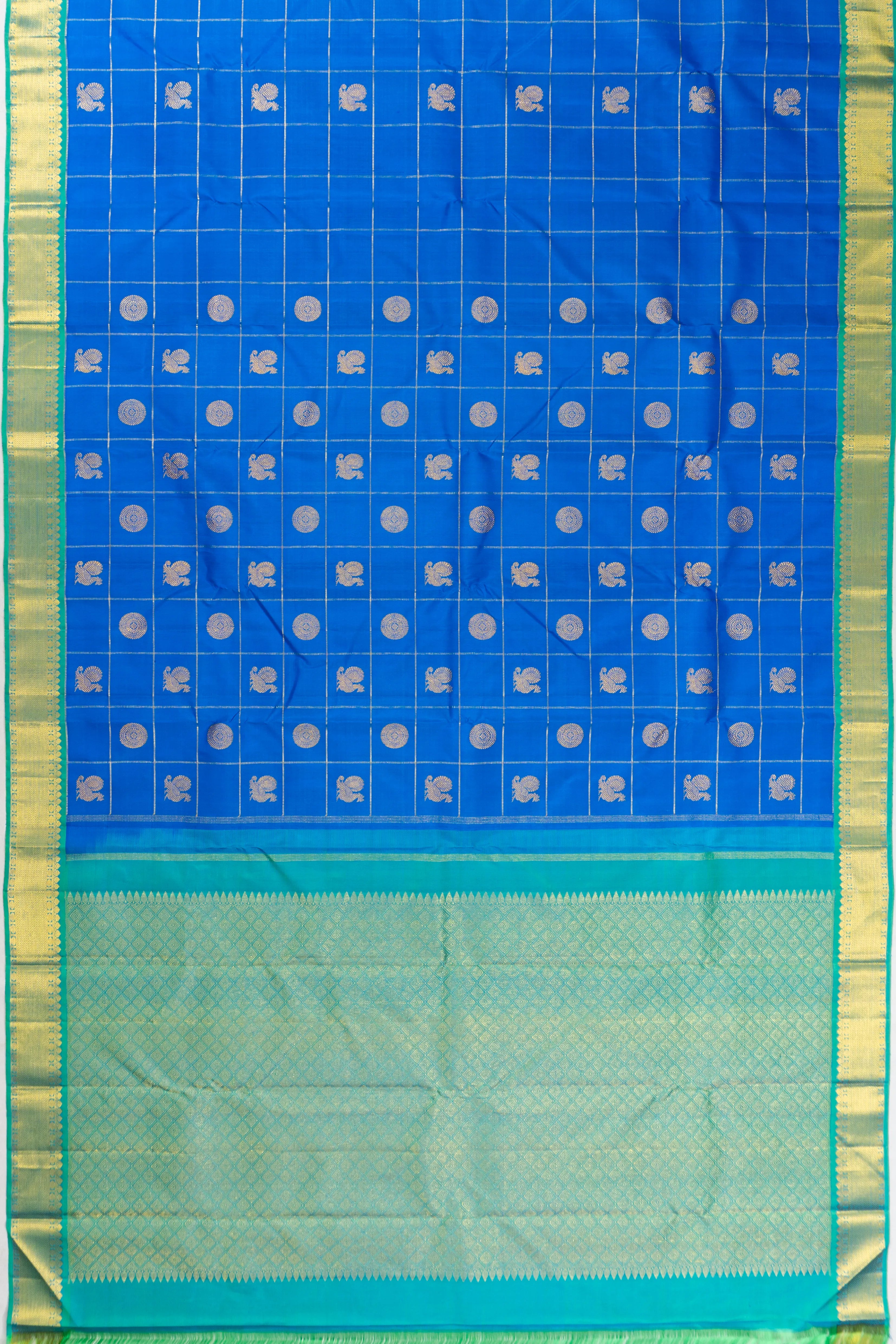 Embrace the allure of tradition with the Classic Kanchipuram Silk Checks And Butta Blue Saree, a testament to exquisite craftsmanship The body is adorned with gold zari checks interspersed with captivating floral and peacock motifs, creating a dance of elegance across the rich silk fabric