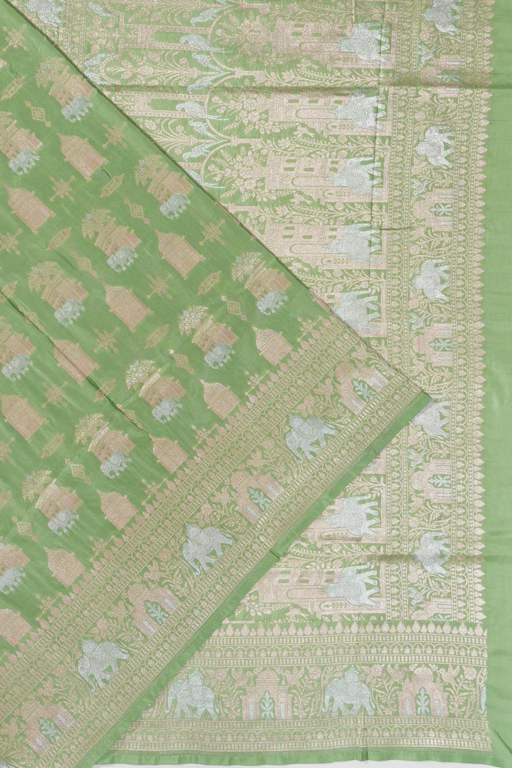 The saree's body radiates with the elegance of its green silk base, exquisitely complemented by intricate gold and silver zari brocade