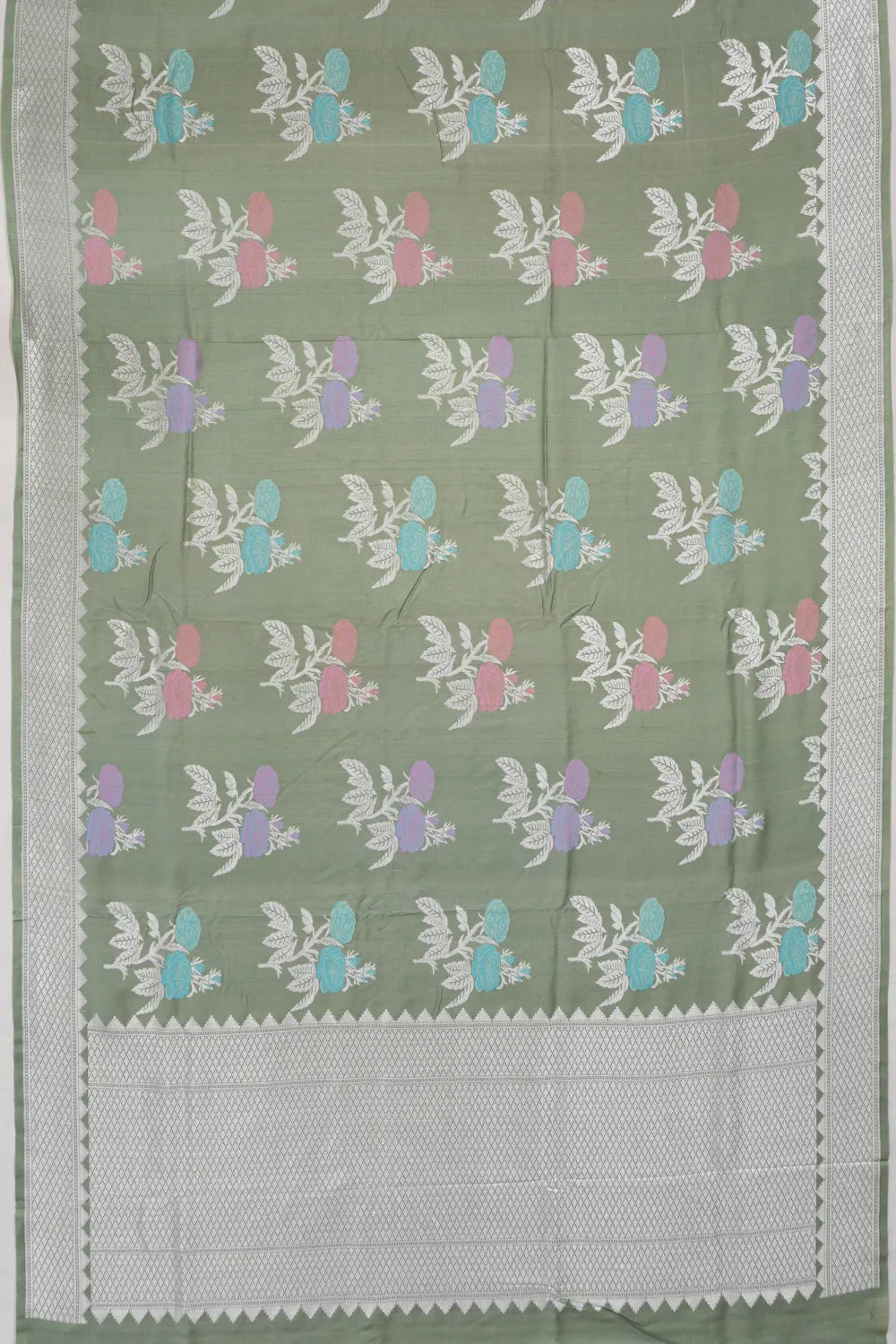 A small, yet striking, self silver zari brocade border enhances the sarees design, providing a harmonious finish that ties the entire look together