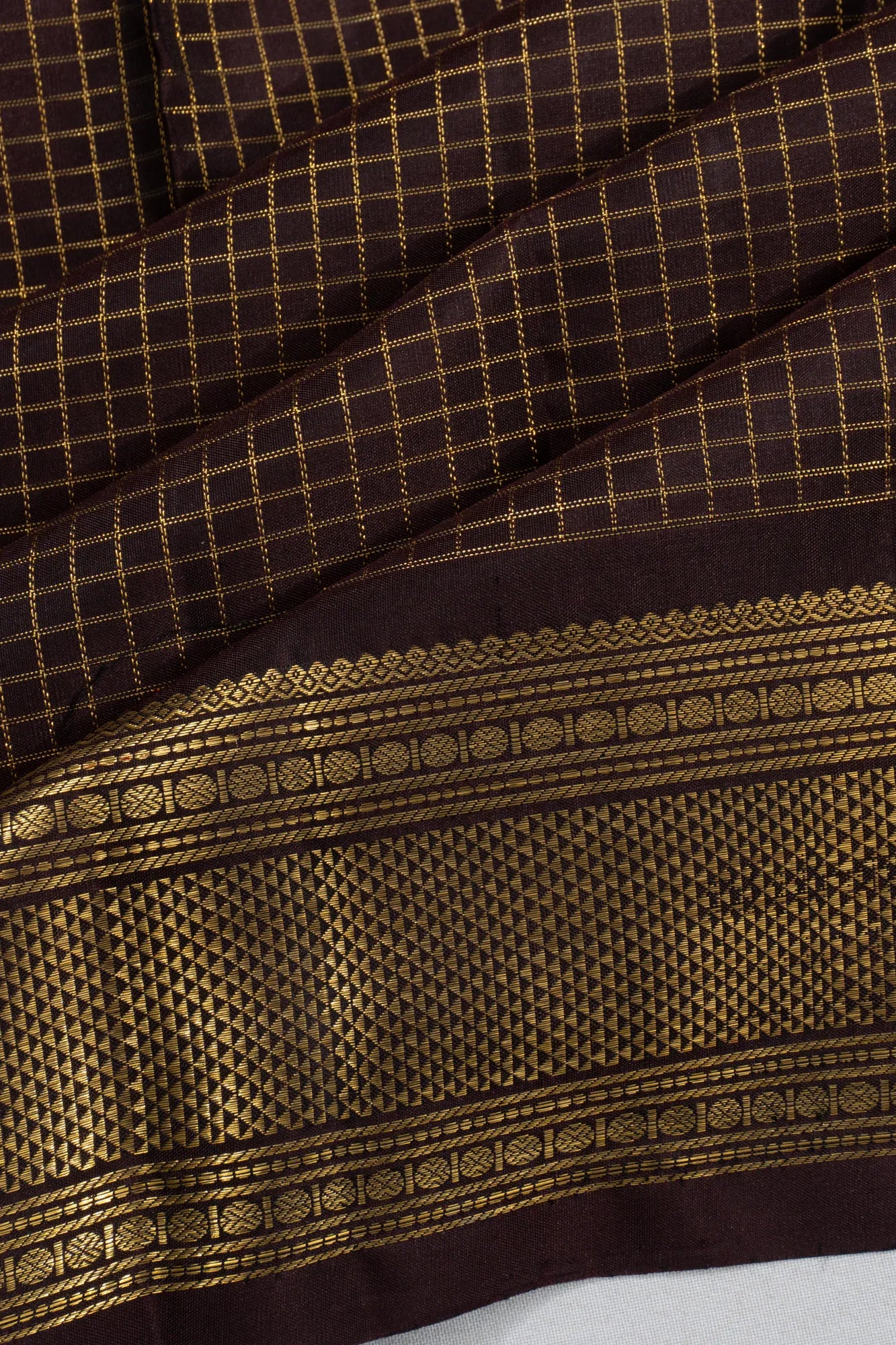 Immerse yourself in the heritage of Kanchipuram with this Classic Brown Silk Saree, a luxurious creation that exudes timeless grace The saree's body is adorned with refined checks, creating a subtle yet striking pattern that speaks to its traditional roots The self zari small border adds a touch of sophistication, illuminating the saree with an exquisite shimmer