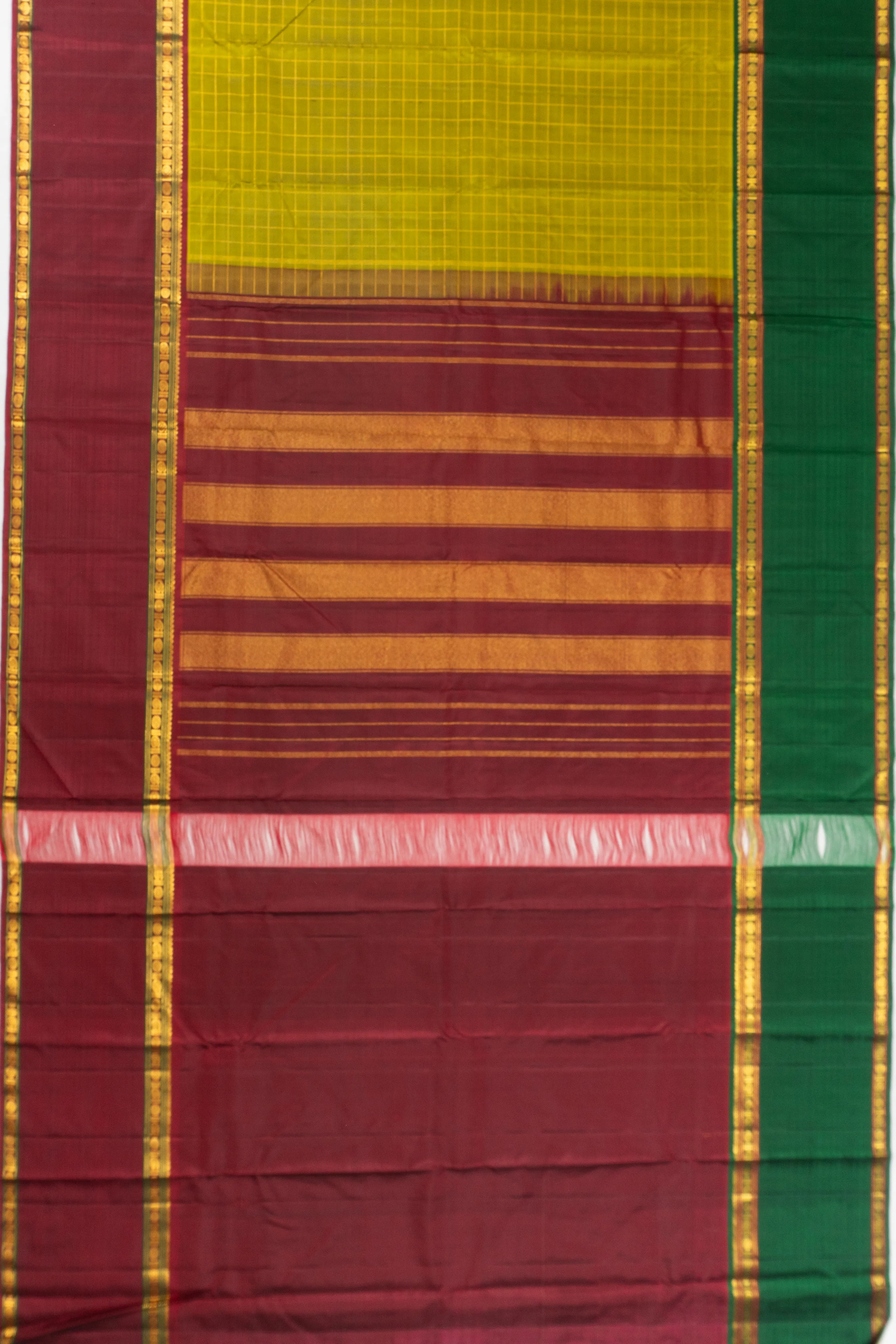 Classic Kanchipuram Silk Checks Parrot Green Saree With Rettai Pettu Ganga Jamuna Border