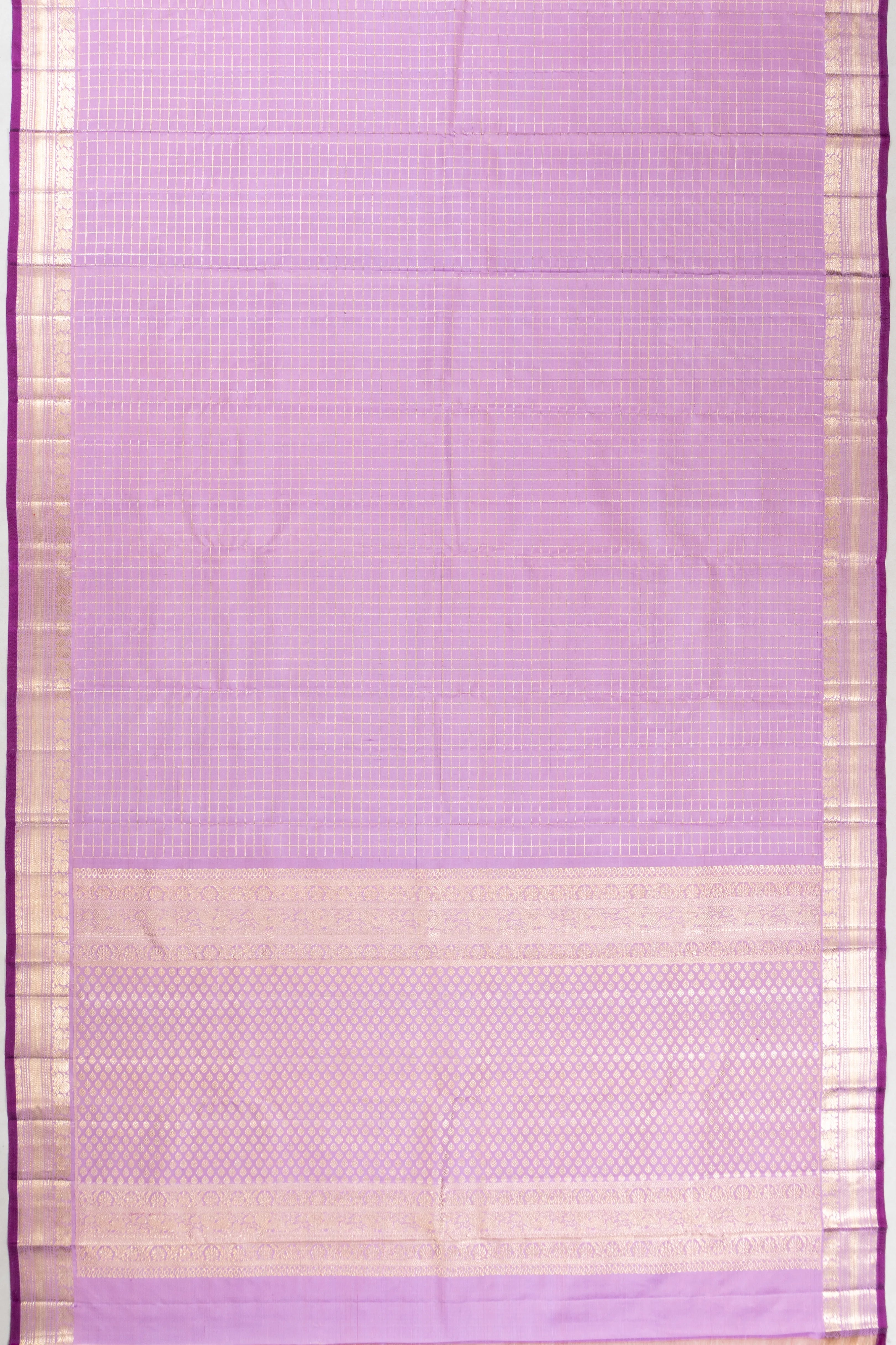The body is adorned with gold zari checks, exuding a delicate shimmer that adds a touch of opulence to the graceful lavender hue