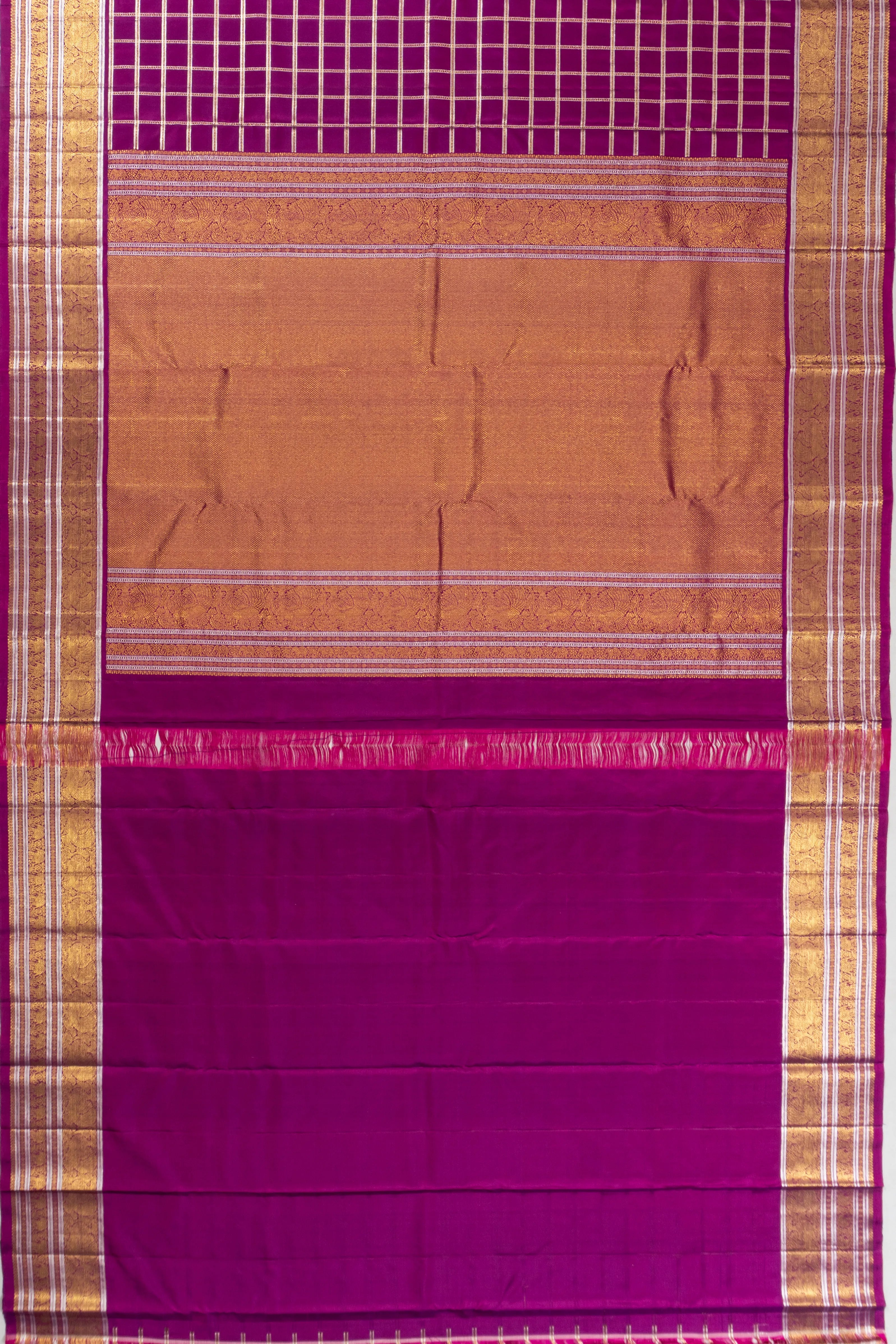 The saree's body features luxurious gold and silver zari checks that dance elegantly across the fabric, creating a captivating visual rhythm