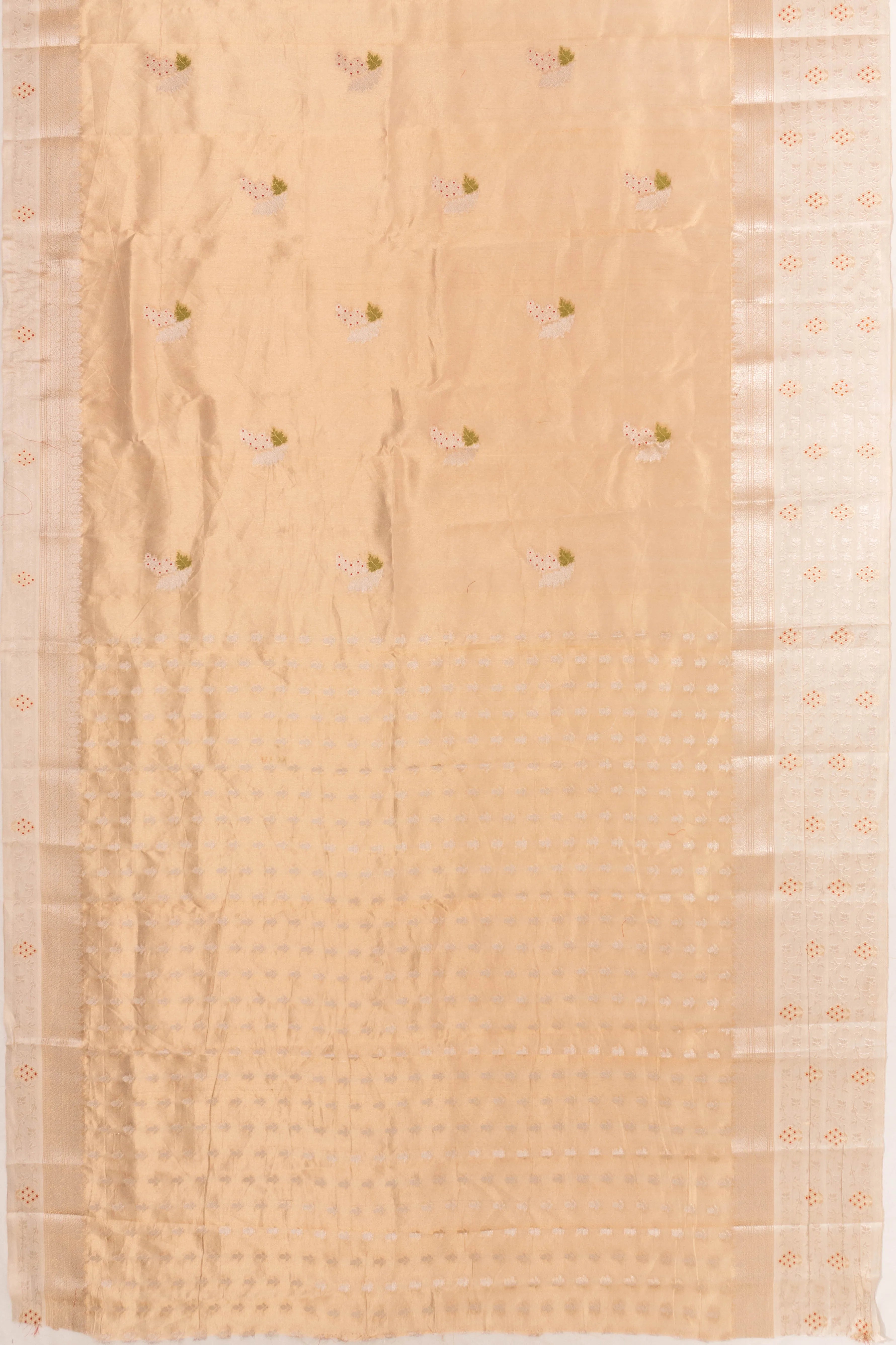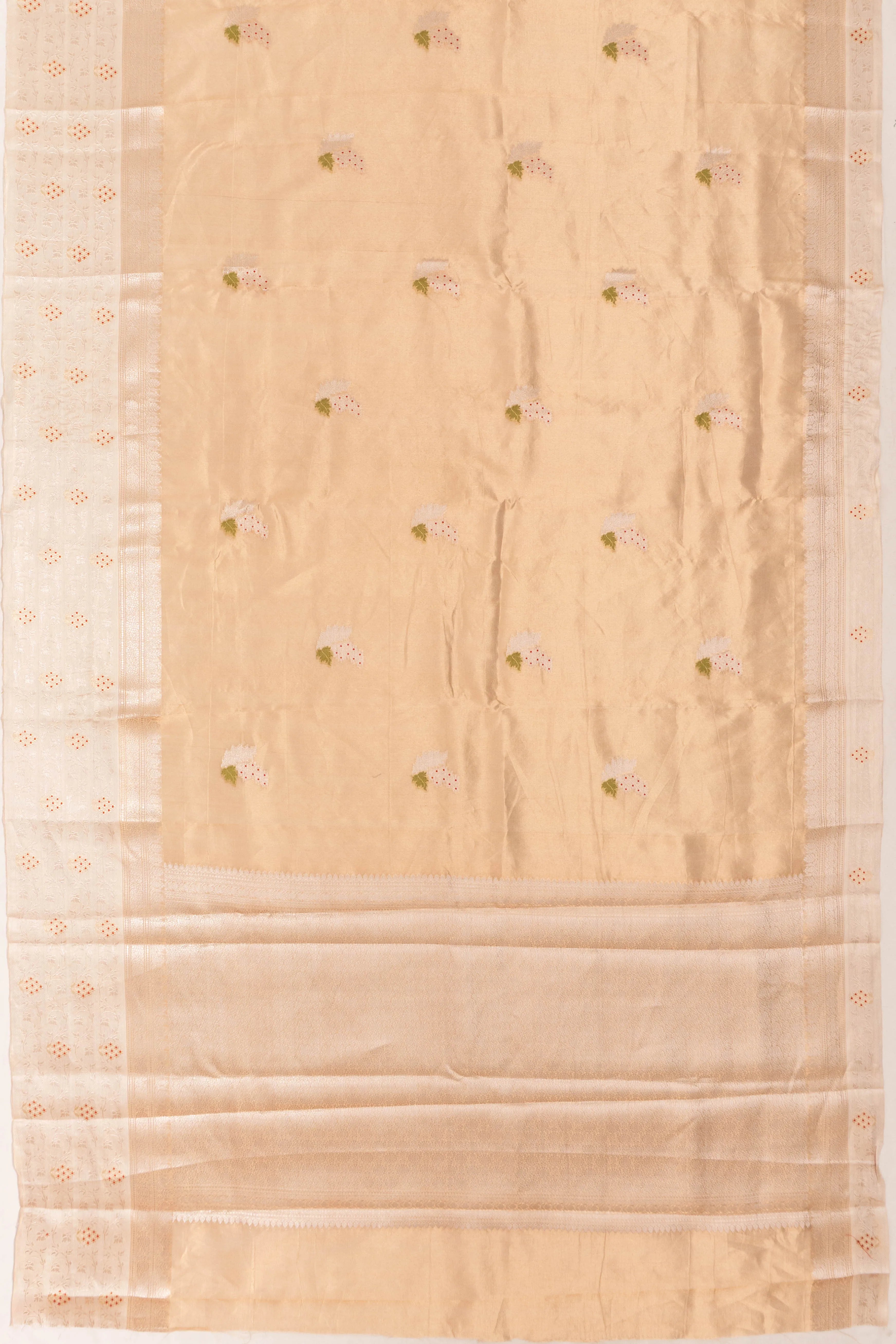 A harmonious blend of tradition and luxury, the saree features a medium cream border intricately woven with contrast gold zari floral vines, enhancing its regal appeal