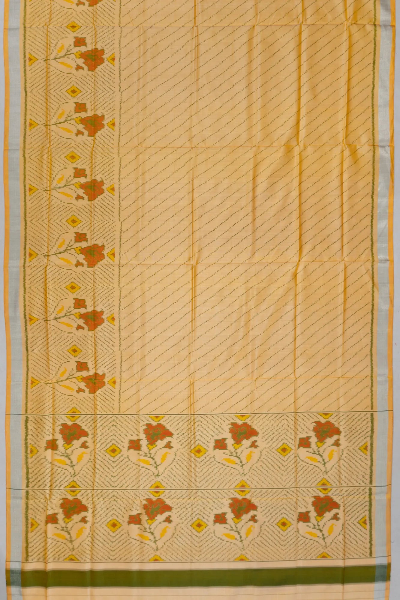 The body showcases exquisite ikat diagonal lines, seamlessly blending with floral ikat motifs on its pleats, creating a captivating visual flow