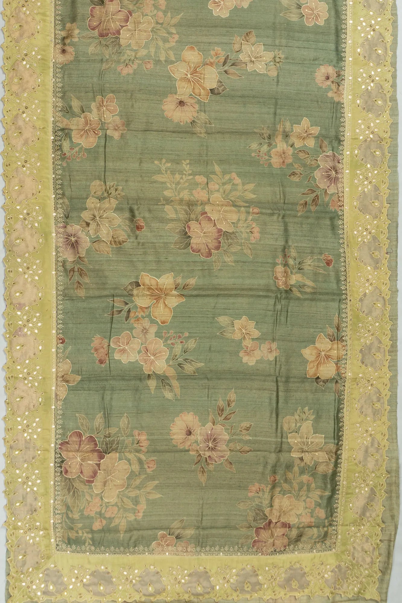 Tussar Floral Printed Grey Saree With Embroidery Outlined
