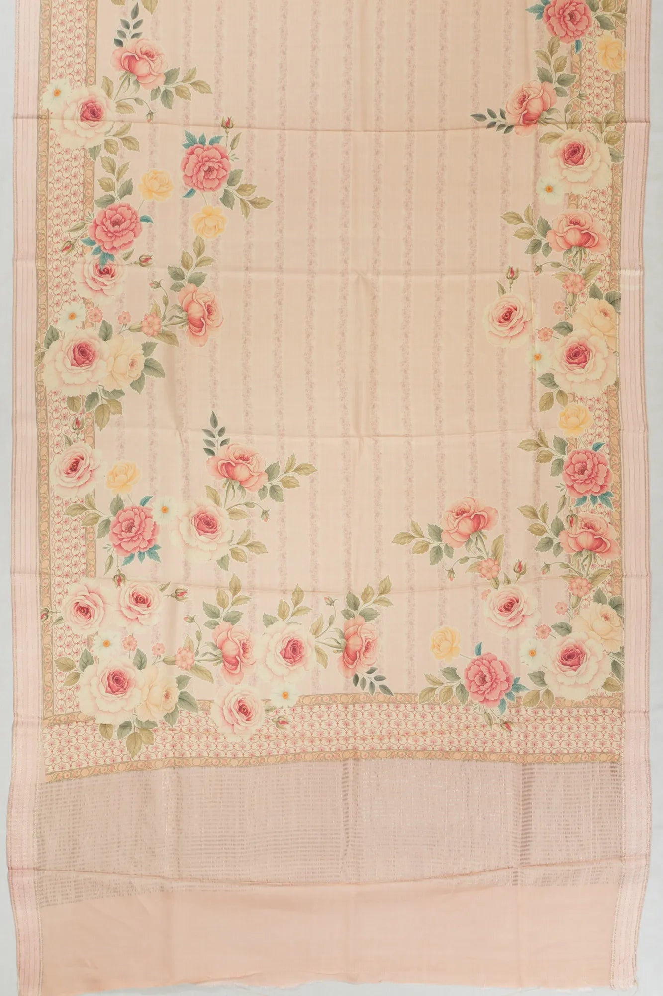 Completing the ensemble is the coordinated pallu, also adorned with intricate floral prints, adding an element of refined detail and sophistication