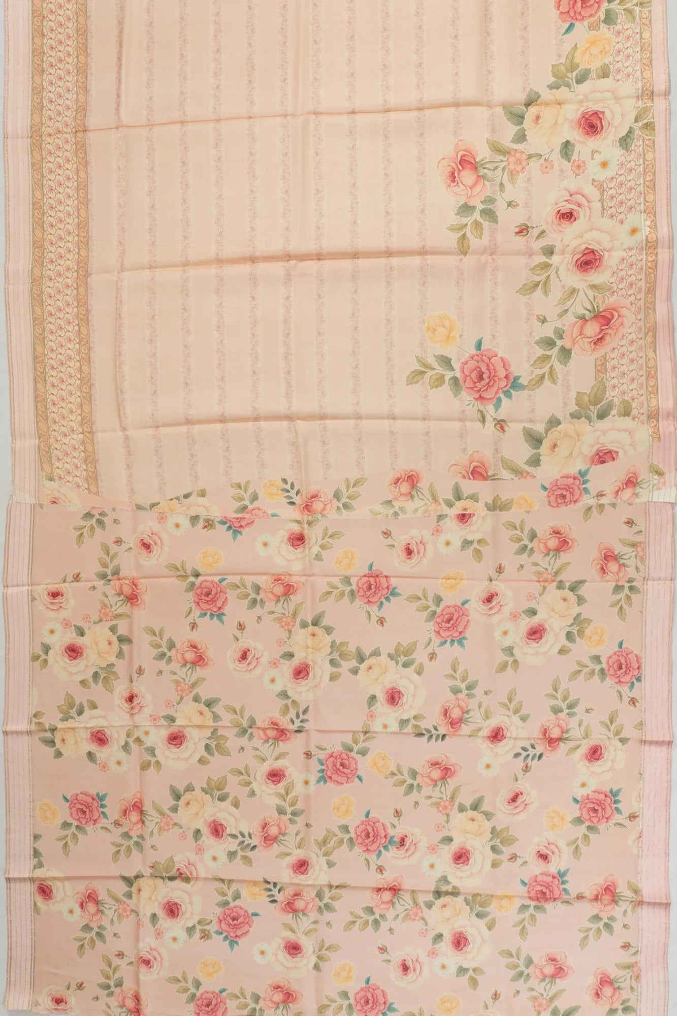 The saree features a self multicolour floral printed medium border, harmoniously enhancing the overall design with its vibrant hues