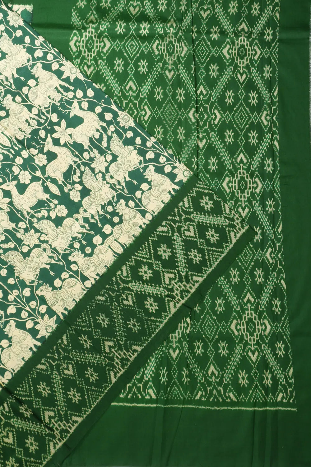 Pochampally Silk Floral Printed Green Saree With Ikat Border