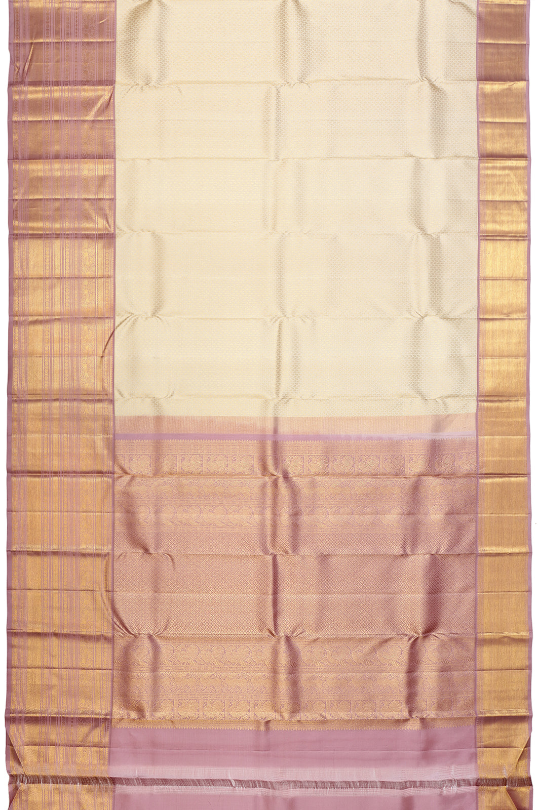 A striking contrast is provided by the medium lavender border, intricately embellished with gold zari diagonal lines and brocade, featuring majestic yali motifs intertwined with floral vines