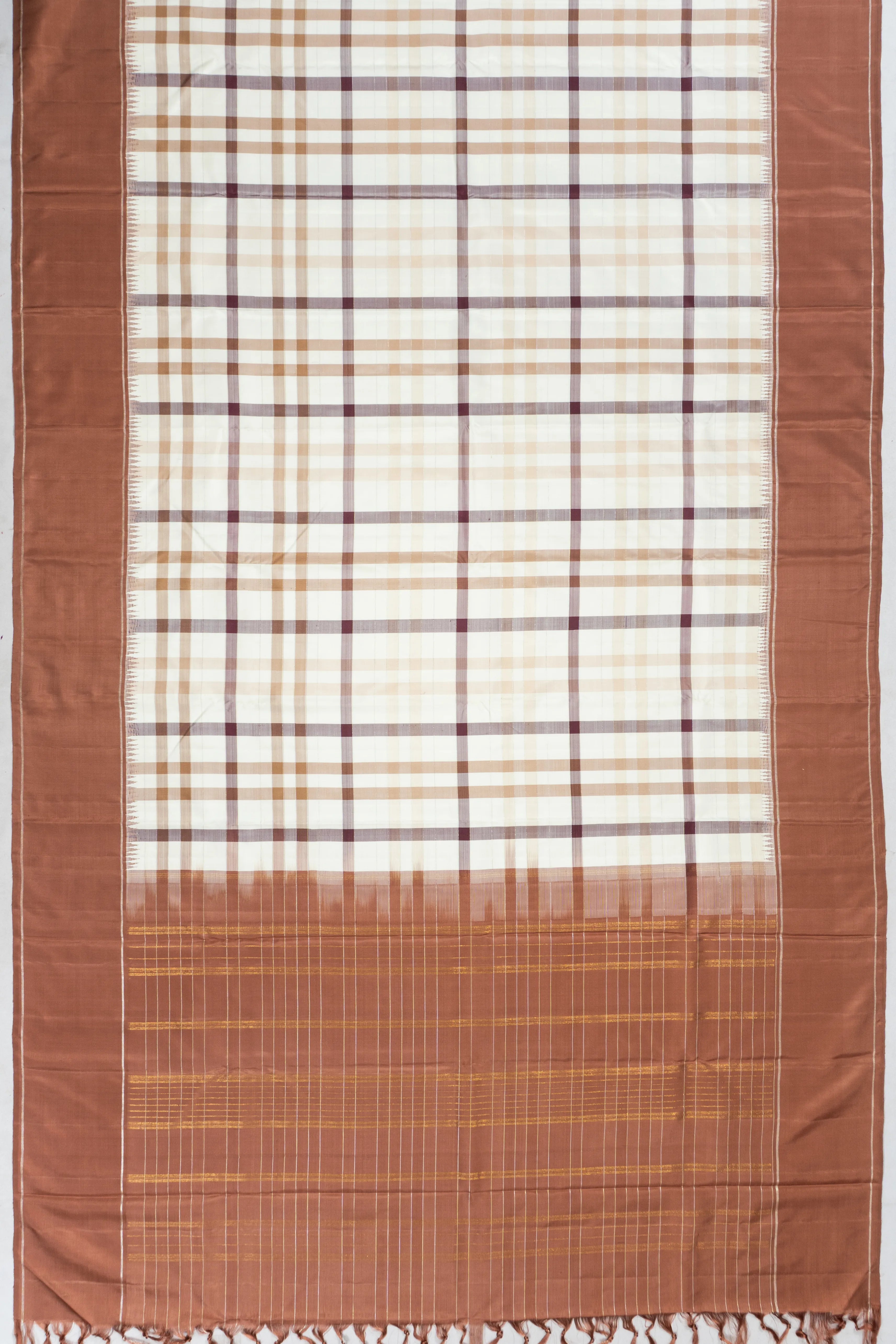 The saree features a pallu with harmonious gold and silver zari checks, offering a luxurious finish that enhances its overall allure