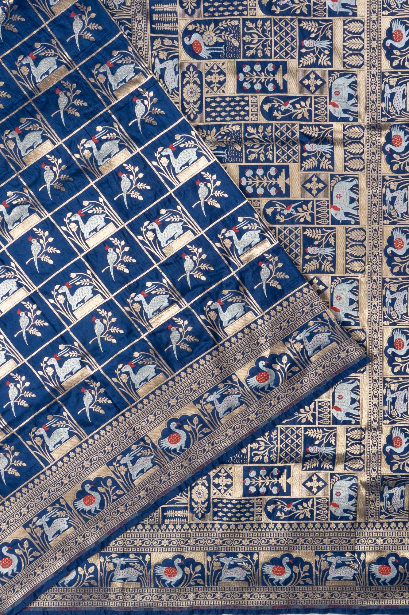 The saree's border, a symphony of self gold zari floral brocade, is enriched with silver zari peacock and deer motifs, creating a harmonious blend of flora and fauna