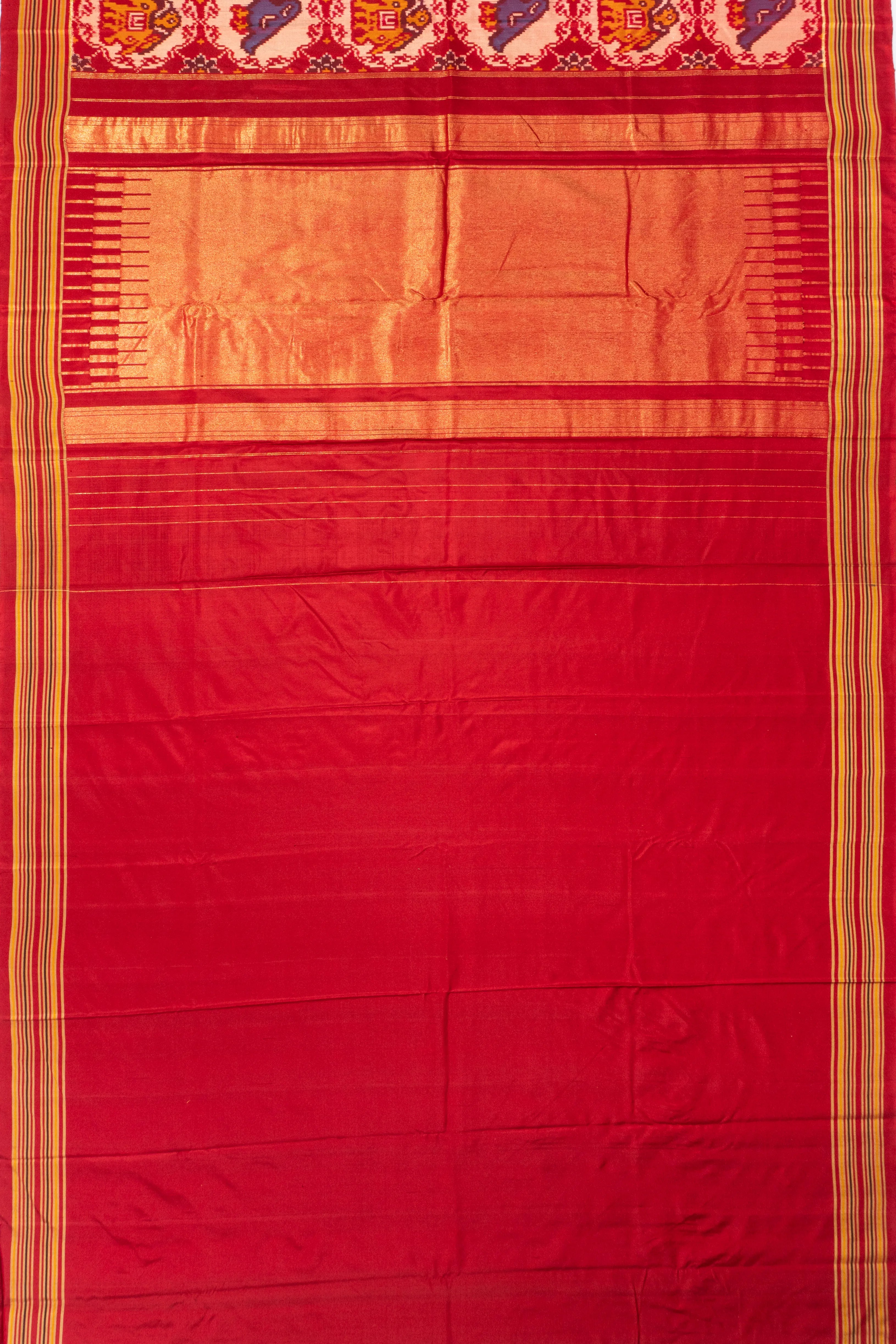 A small red border with horizontal lines adds a touch of contrast, while the pallu is adorned with opulent gold zari kaddi work, exuding a sense of regal sophistication