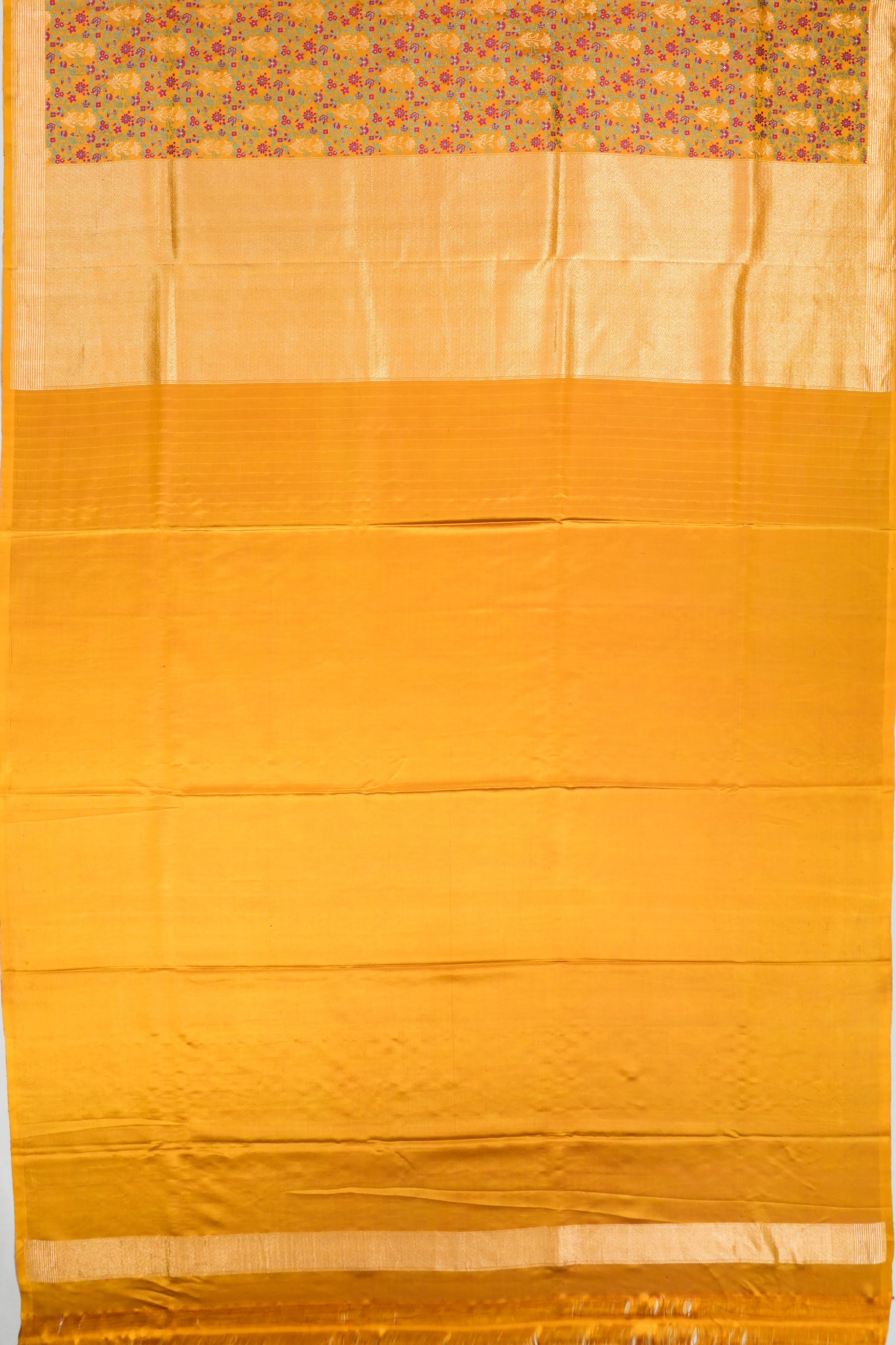 The zari work shimmers softly, enhancing the rich yellow hue with a subtle sheen that speaks volumes of its luxurious craftsmanship