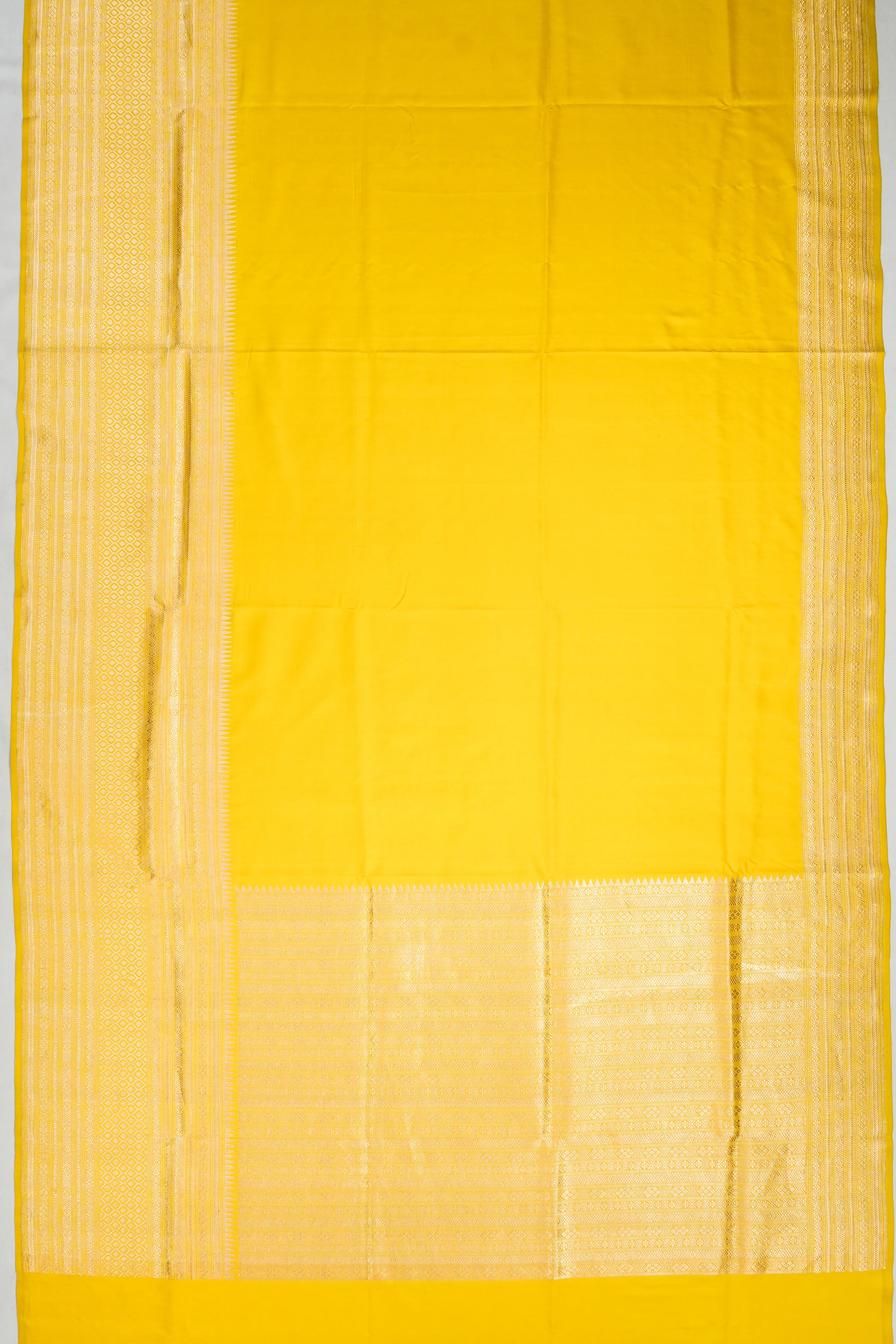 Crafted in pure silk, the saree's plain body radiates a subtle sophistication, allowing the richness of the fabric to speak for itself