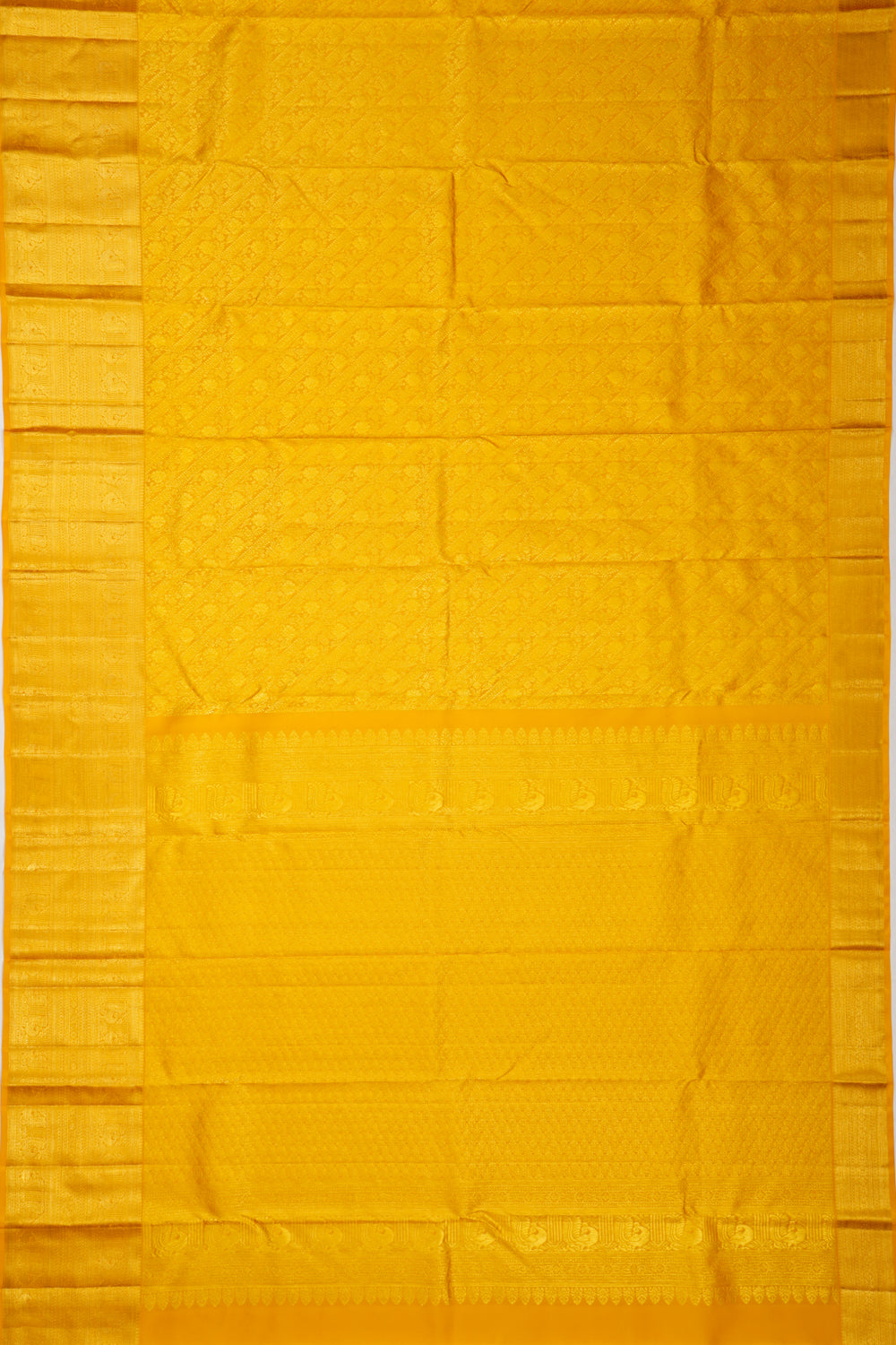 The saree's body is woven with luxurious silk, offering a vibrant yellow hue that exudes warmth and joy, perfect for any festive occasion