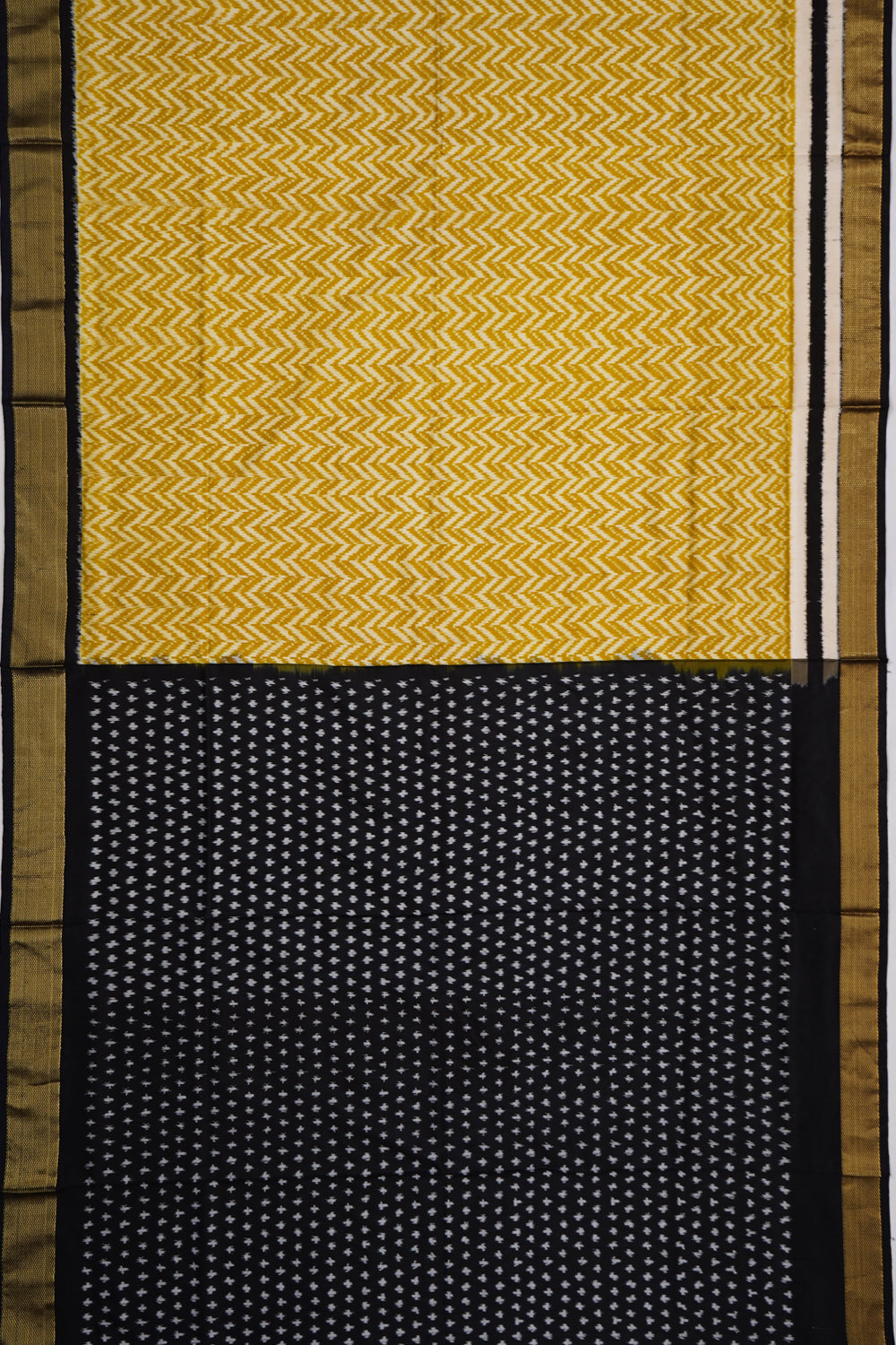 The vibrant yellow body is elegantly juxtaposed by a contrast gold zari black border, adding a touch of regal sophistication to the ensemble