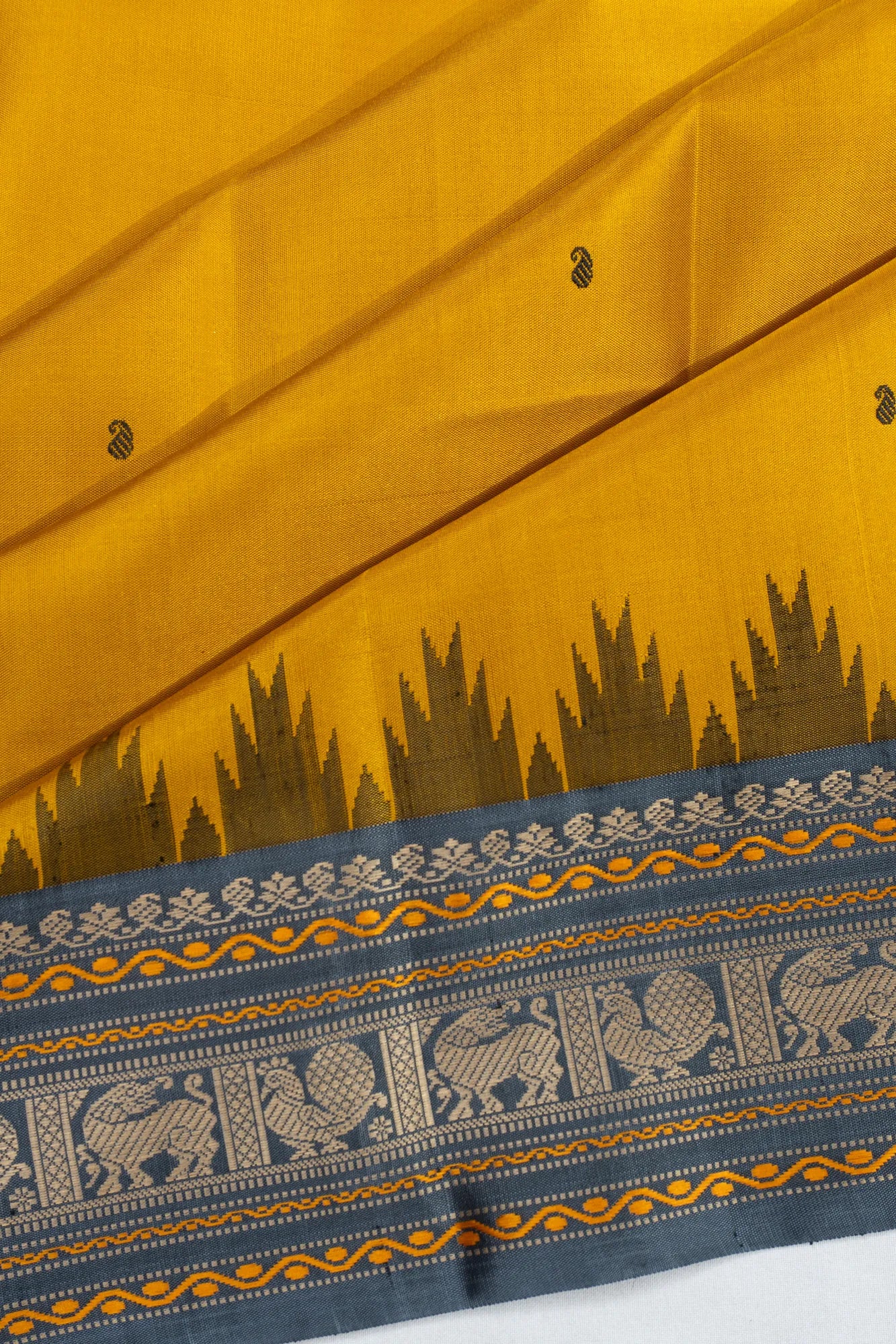 The saree is beautifully enhanced with a contrast grey temple border, where cream-threaded peacock and yali motifs create a harmonious series