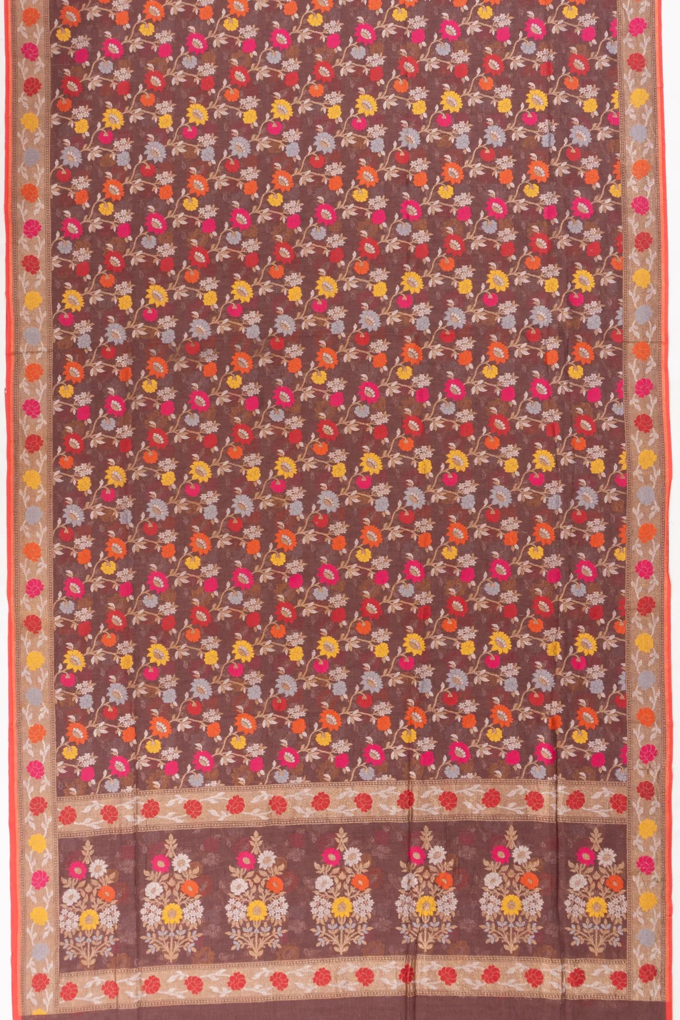 A rich brown cotton base beautifully adorned with all-over floral jamdani inspired weaving, giving the saree a breezy elegance.