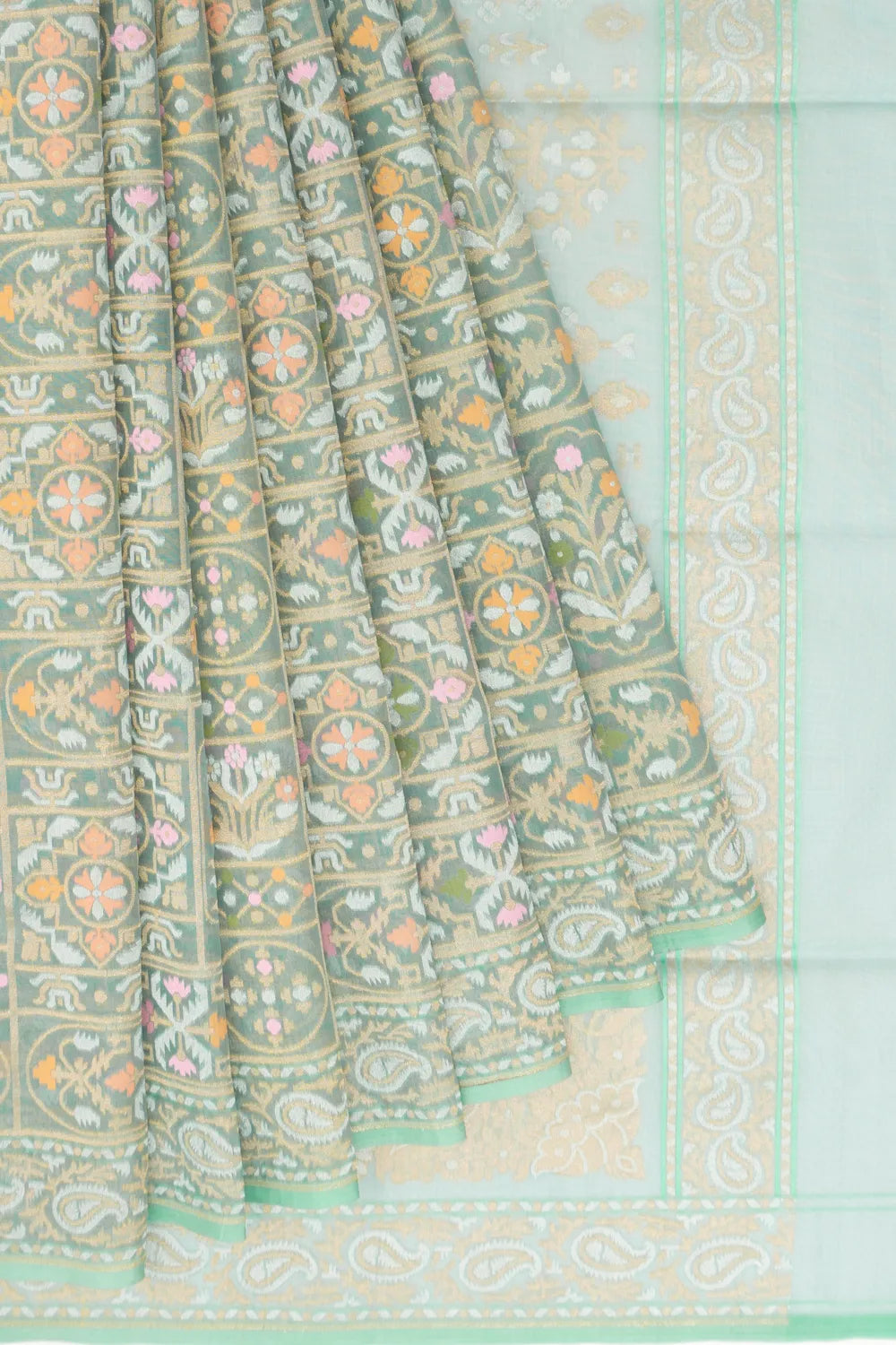 Featuring a delicate floral weave, this saree reflects the finesse of traditional craftsmanship on a sheer cotton base, exuding a soft and dreamy aesthetic.