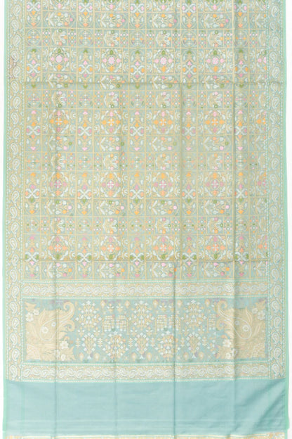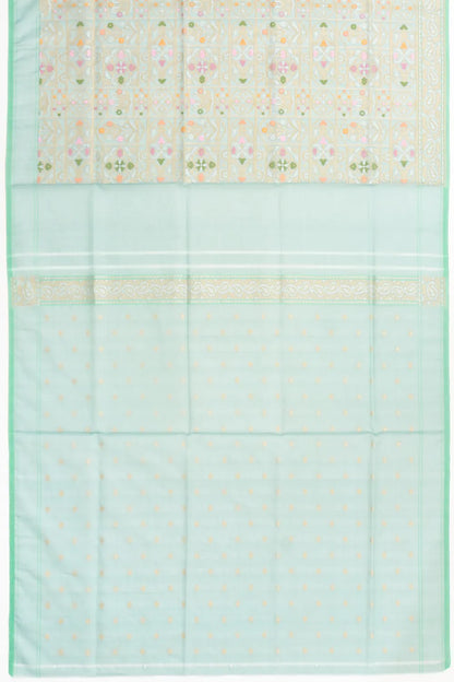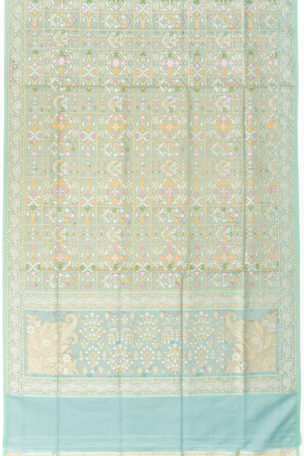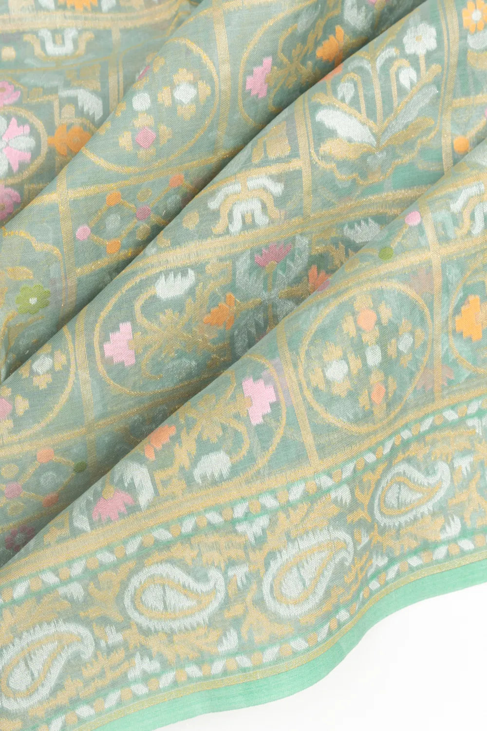 Accompanied by a self gold zari floral butta blouse, providing a touch of opulence to complement the saree’s delicate charm.