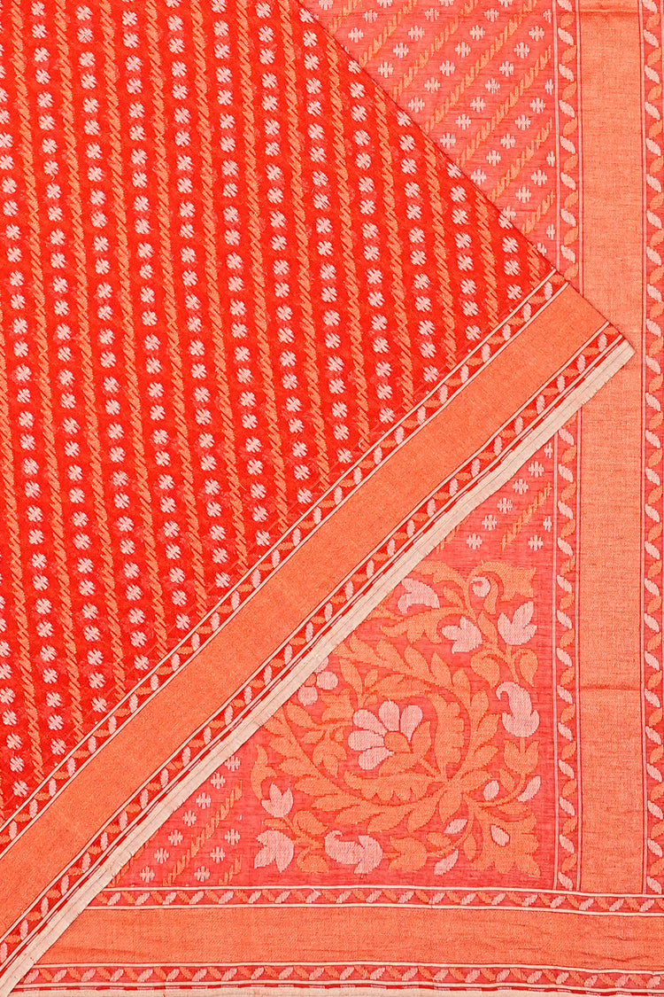 Cut Work floral brocade, creating a rich and intricate design on the vibrant red fabric. Border: Self gold zari kaddi small border with a cream edge, adding an elegant contrast and a refined finish. Pallu: Self gold zari floral brocade pallu with paisleys on its edges, enhancing the saree with a luxurious and detailed design. Blouse: Comes with a self plain blouse, providing a simple and balanced complement to the saree.