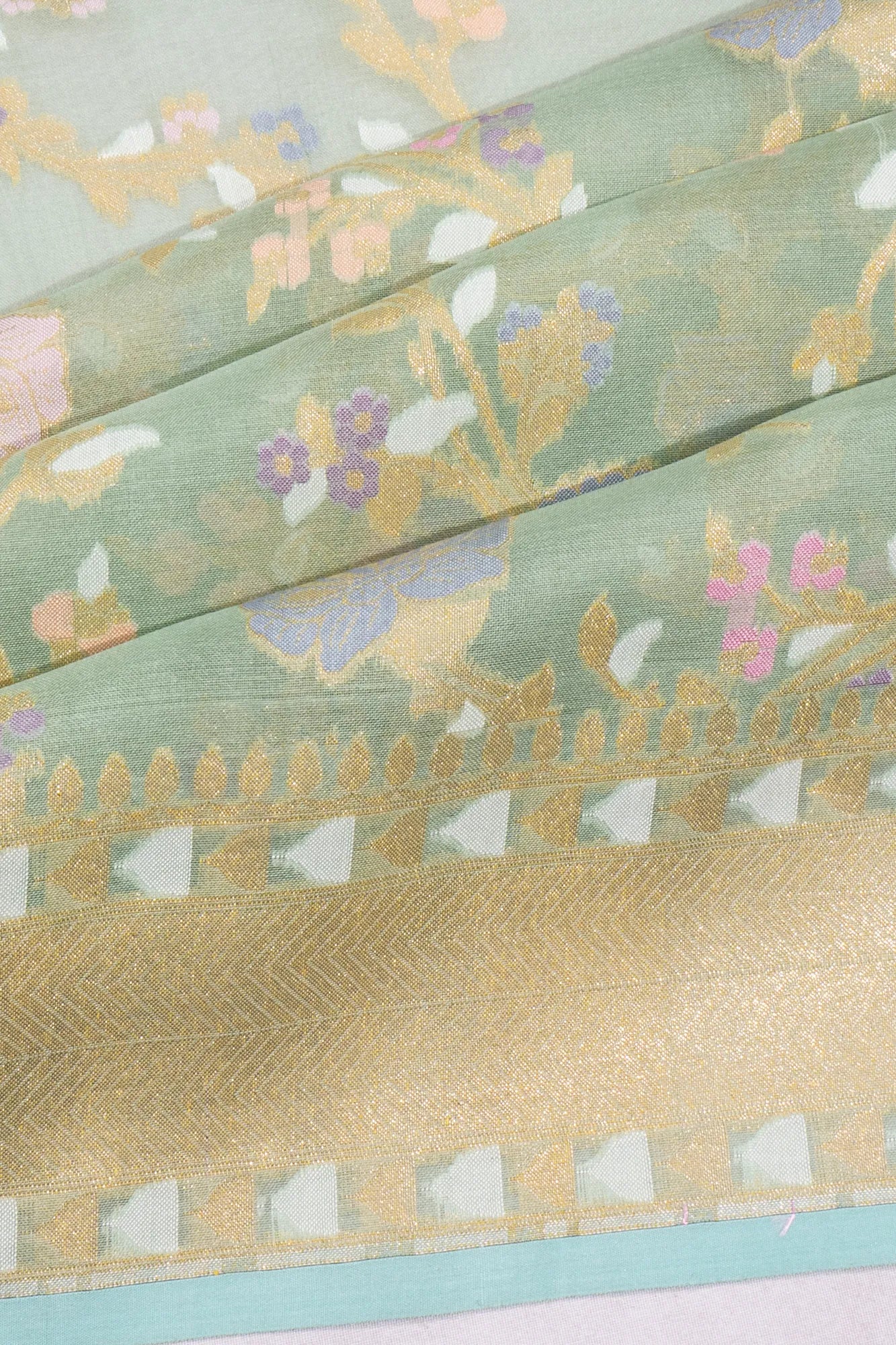 The saree's self gold zari kaddi border, enhanced with a delicate lavender edge, adds a touch of sophistication, while the self gold zari floral butta and brocade pallu provide an enchanting finish