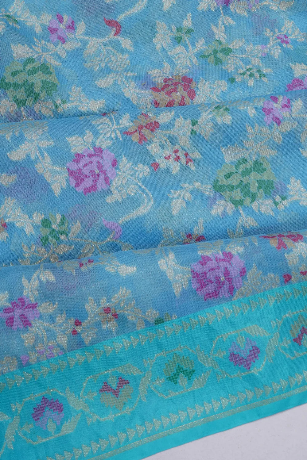 The saree features a delicate border adorned with self gold zari floral brocade and colorful accents, adding a touch of sophistication