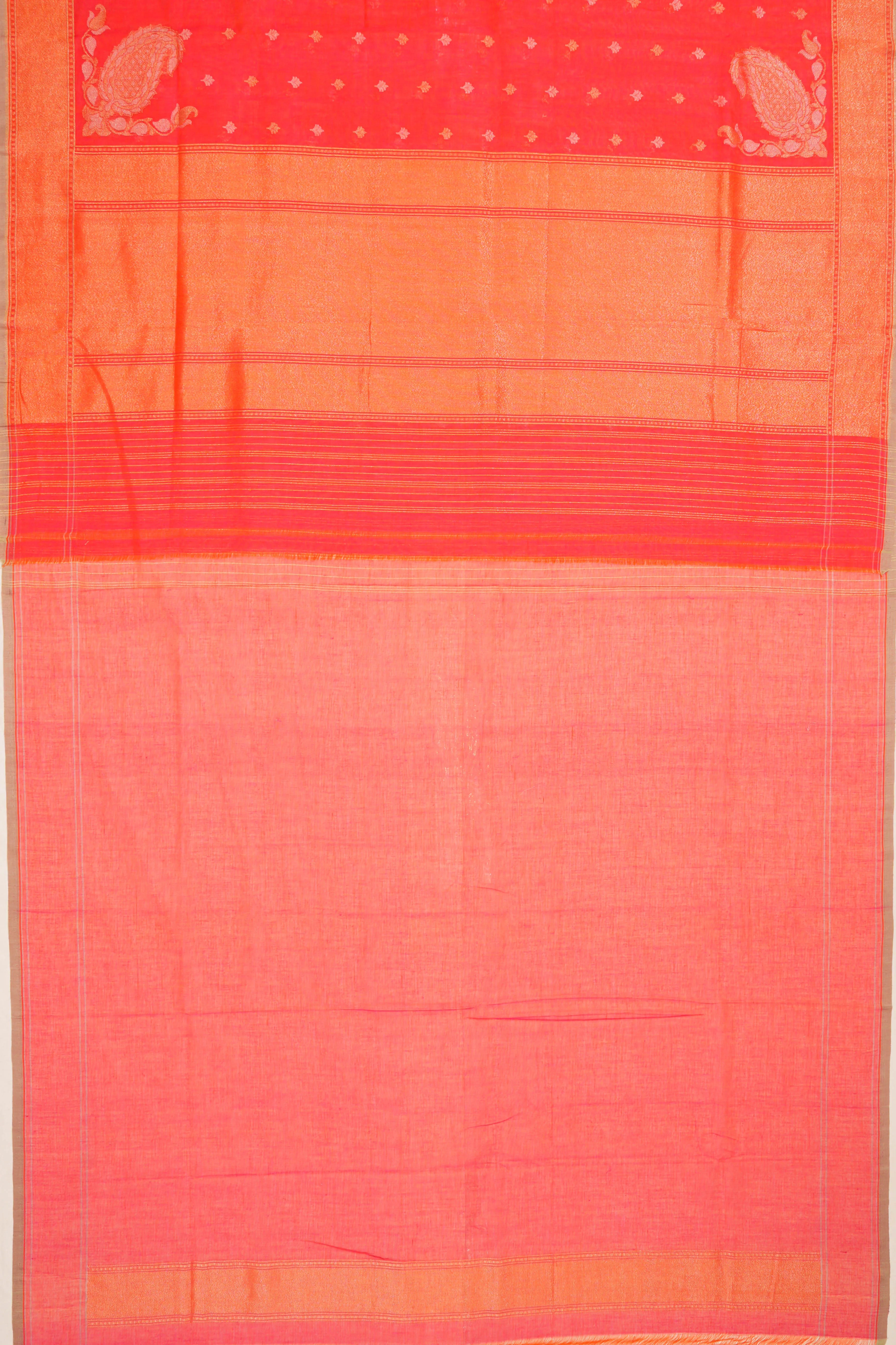 The self gold zari kaddi small border with a cream edge complements the rich red body of the saree, giving it a refined and balanced finish.