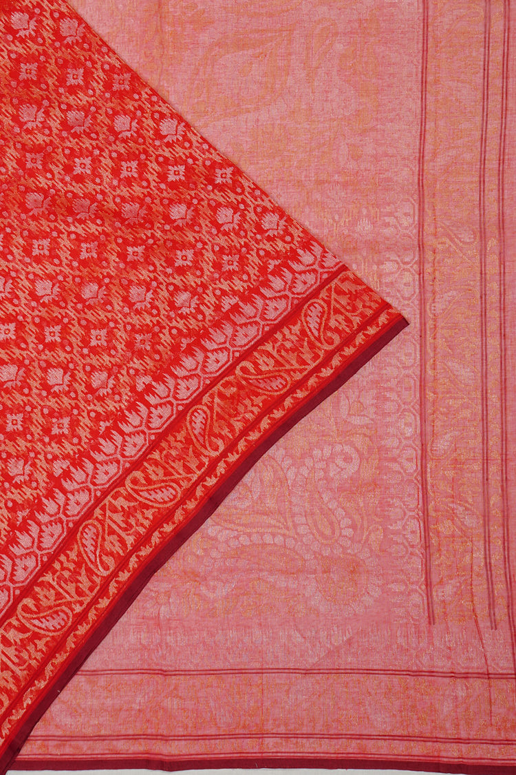 Body: The body of this saree features intricate floral jamdani work, creating a vibrant and detailed design on a rich cotton base.