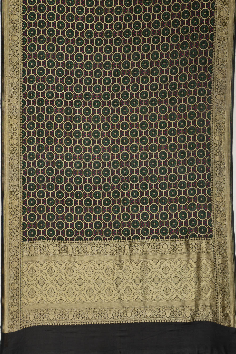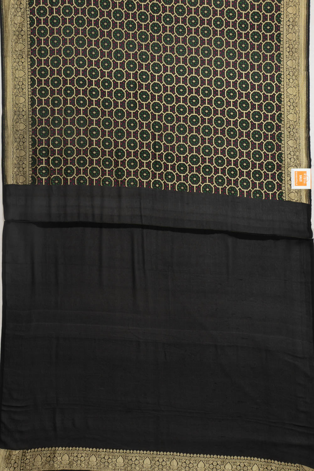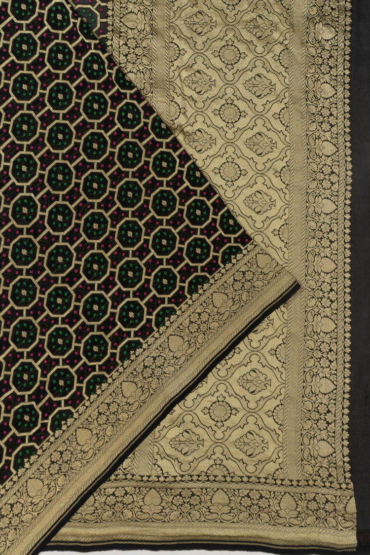 Rich black georgette woven with Bandhani-inspired brocade in luminous gold zari, creating a dramatic and traditional appeal.