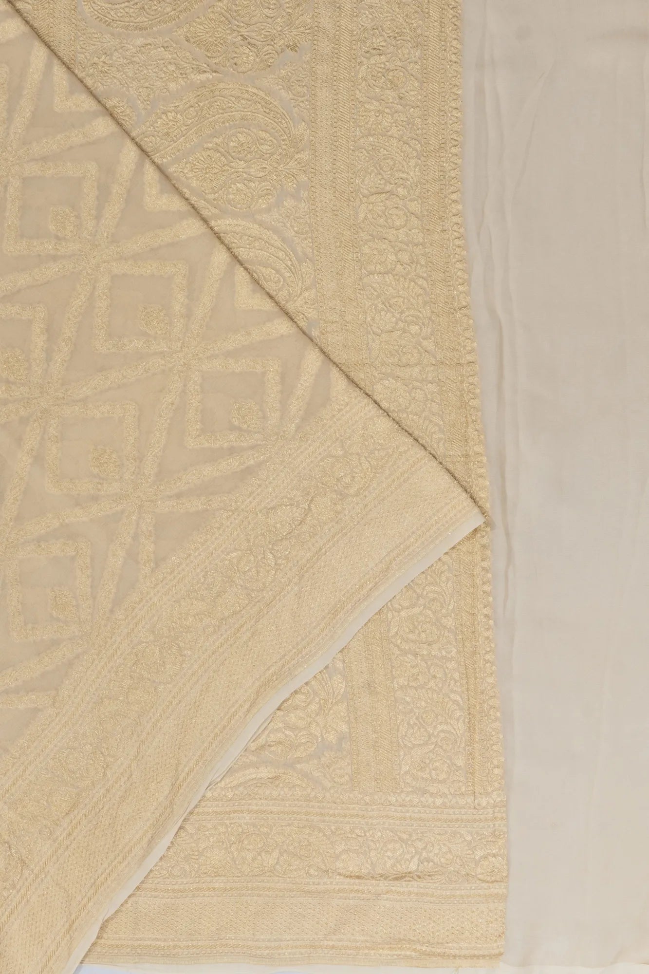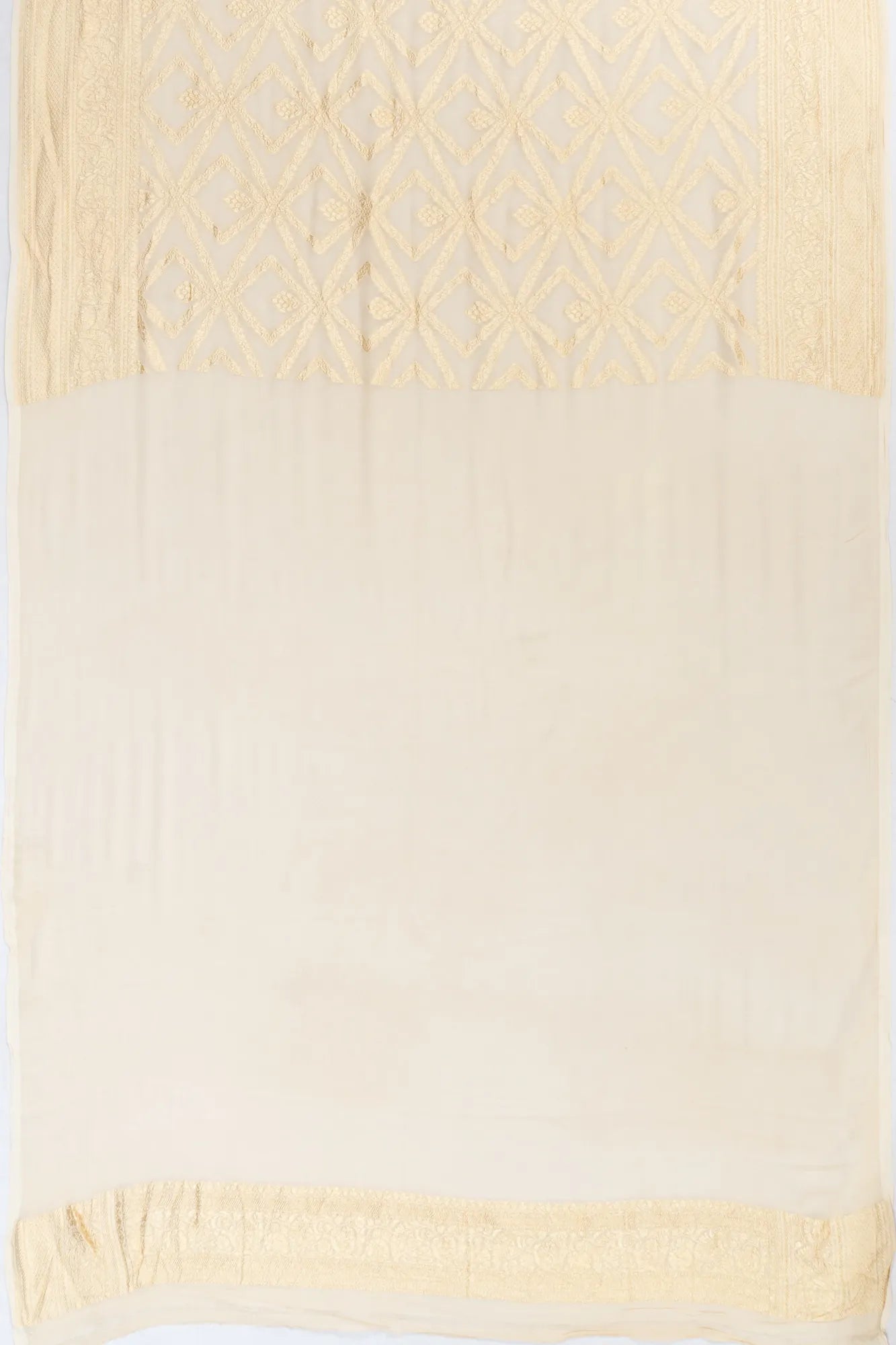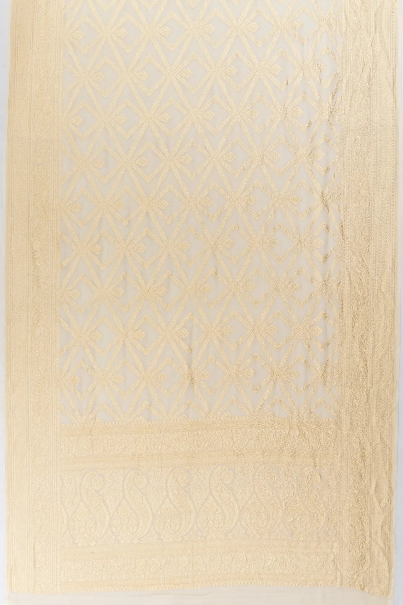 A graceful off-white base intricately woven with gold zari floral and geometrical brocade, exuding understated elegance.