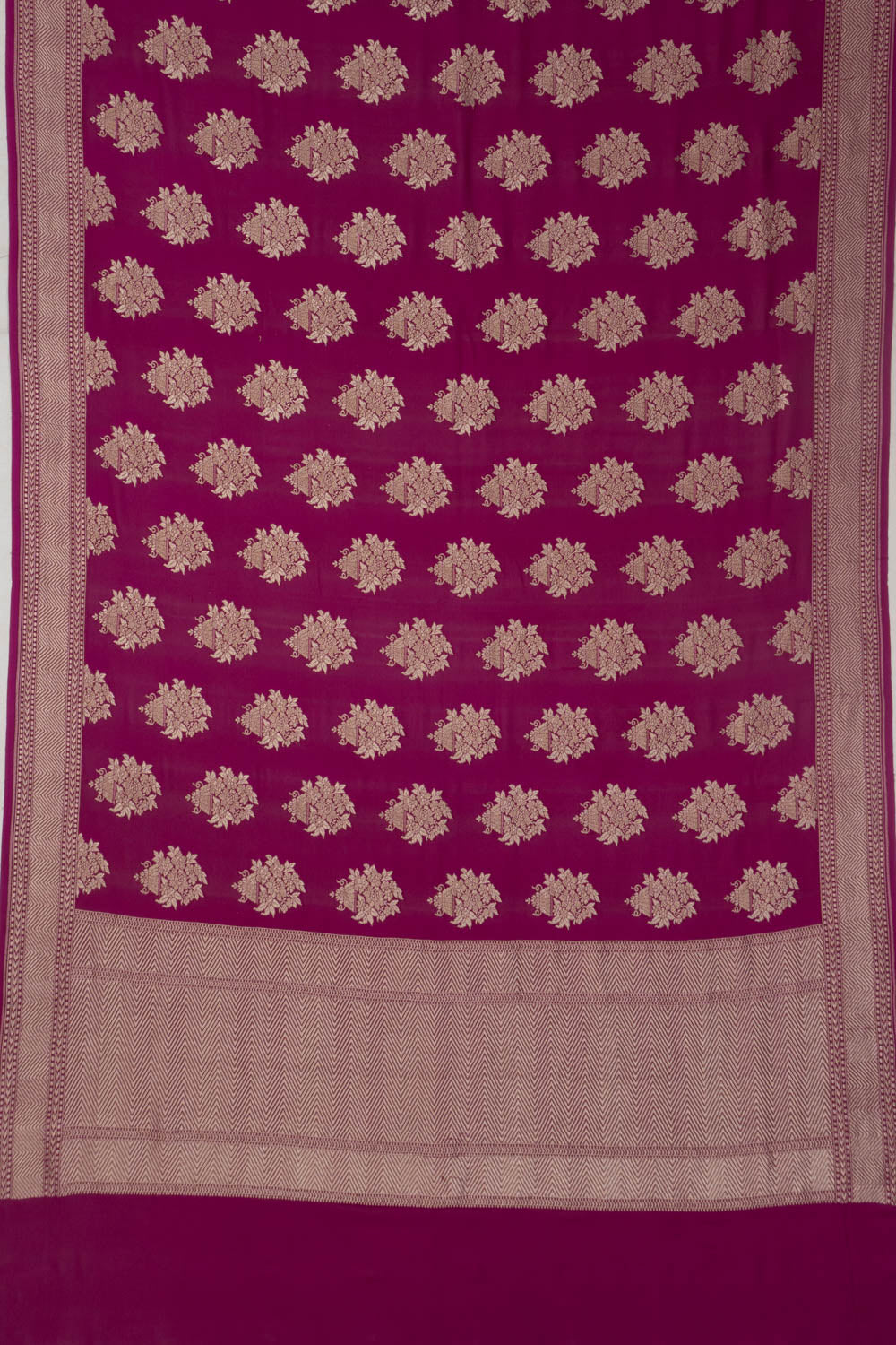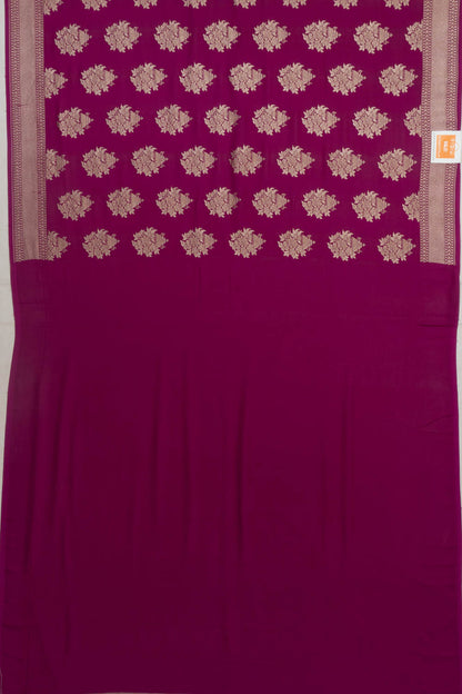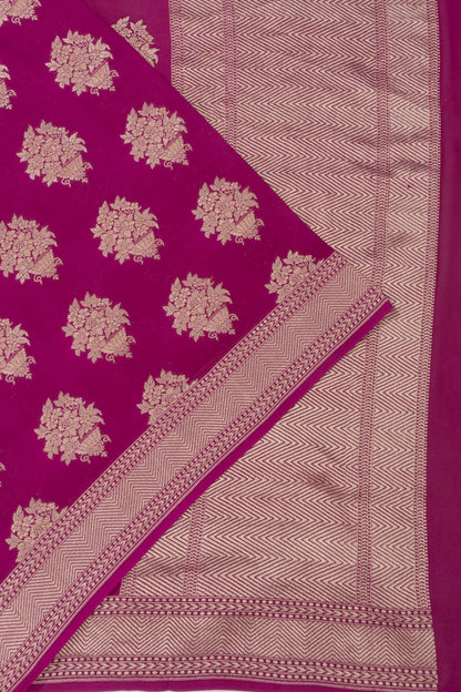 Elegant purple georgette intricately woven with silver zari floral brocade, exuding a soft shimmer and royal charm.