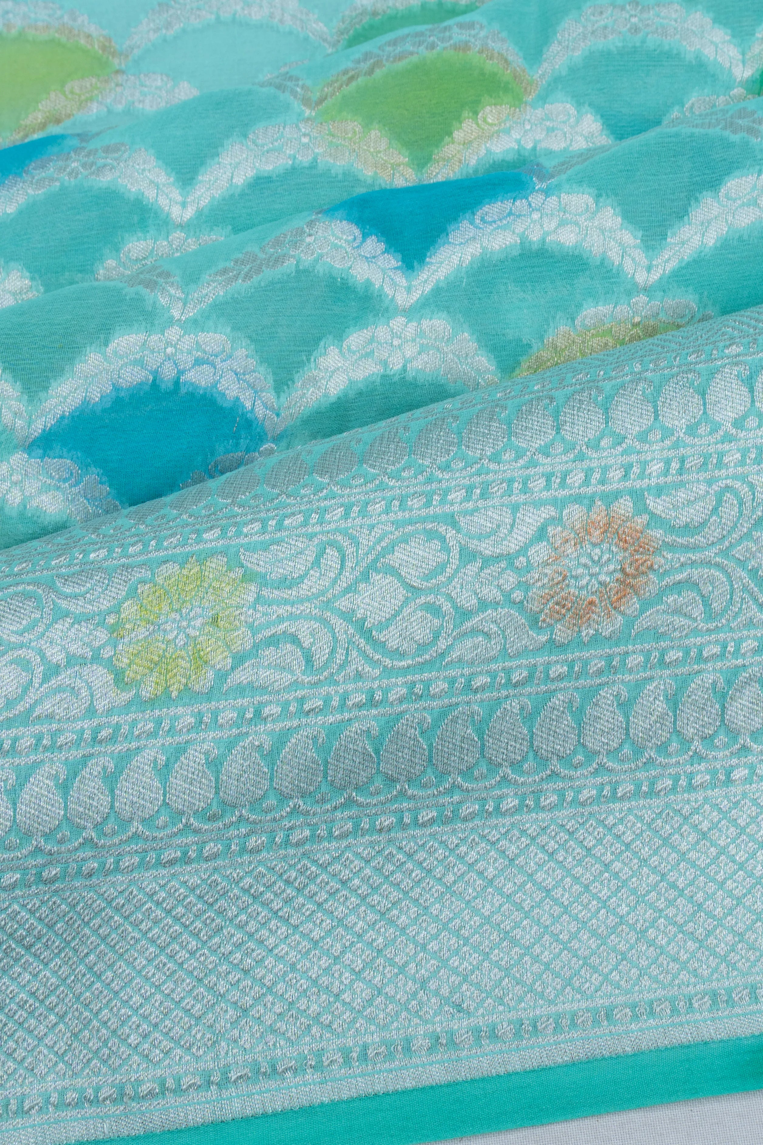 The body is adorned with silver zari floral brocade, creating a graceful interplay of shimmering motifs on the soft sky blue fabric