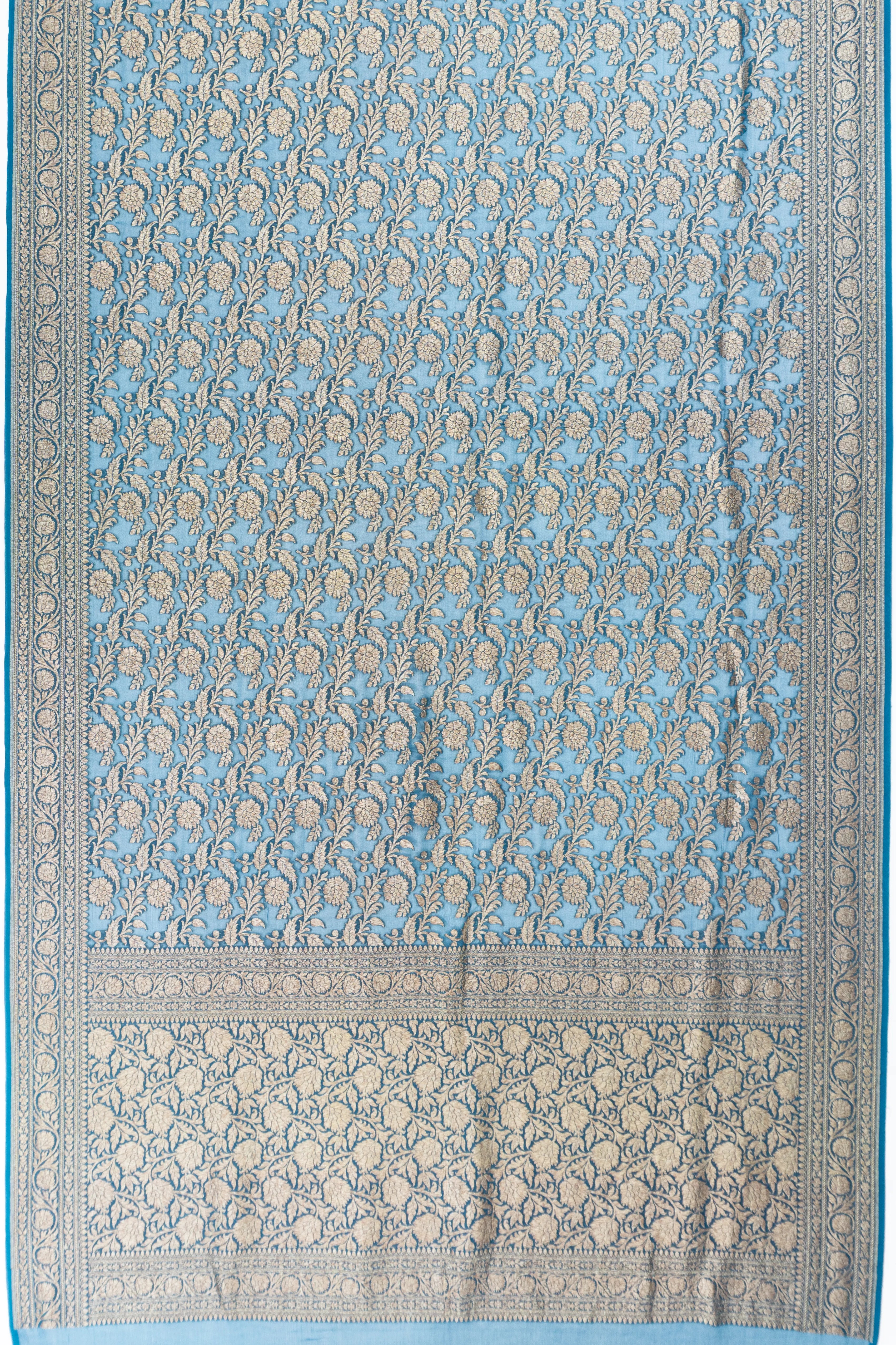 The saree's body is adorned with a luxurious gold zari floral brocade, offering a graceful touch of traditional artistry that catches the eye with its subtle sheen