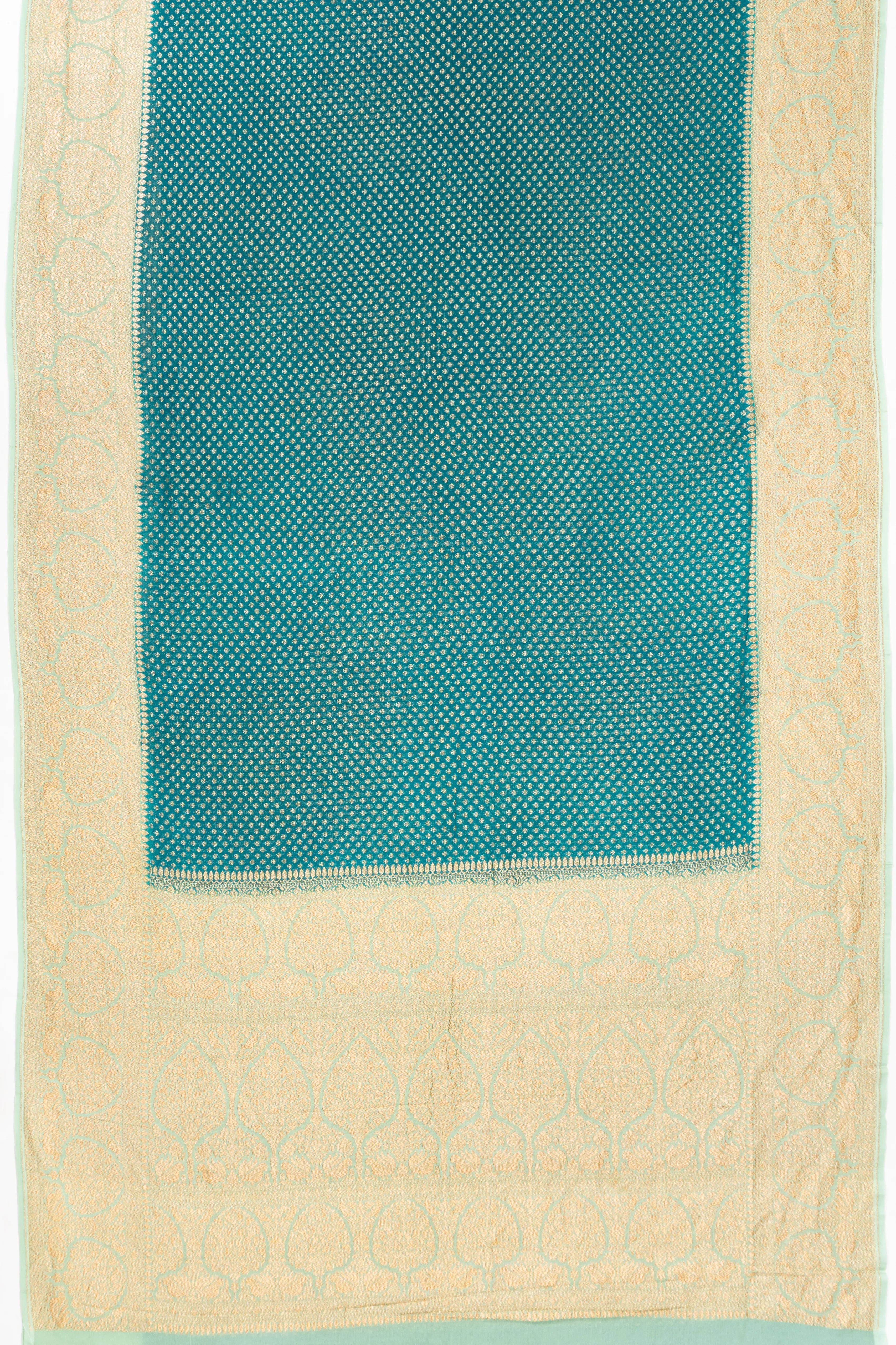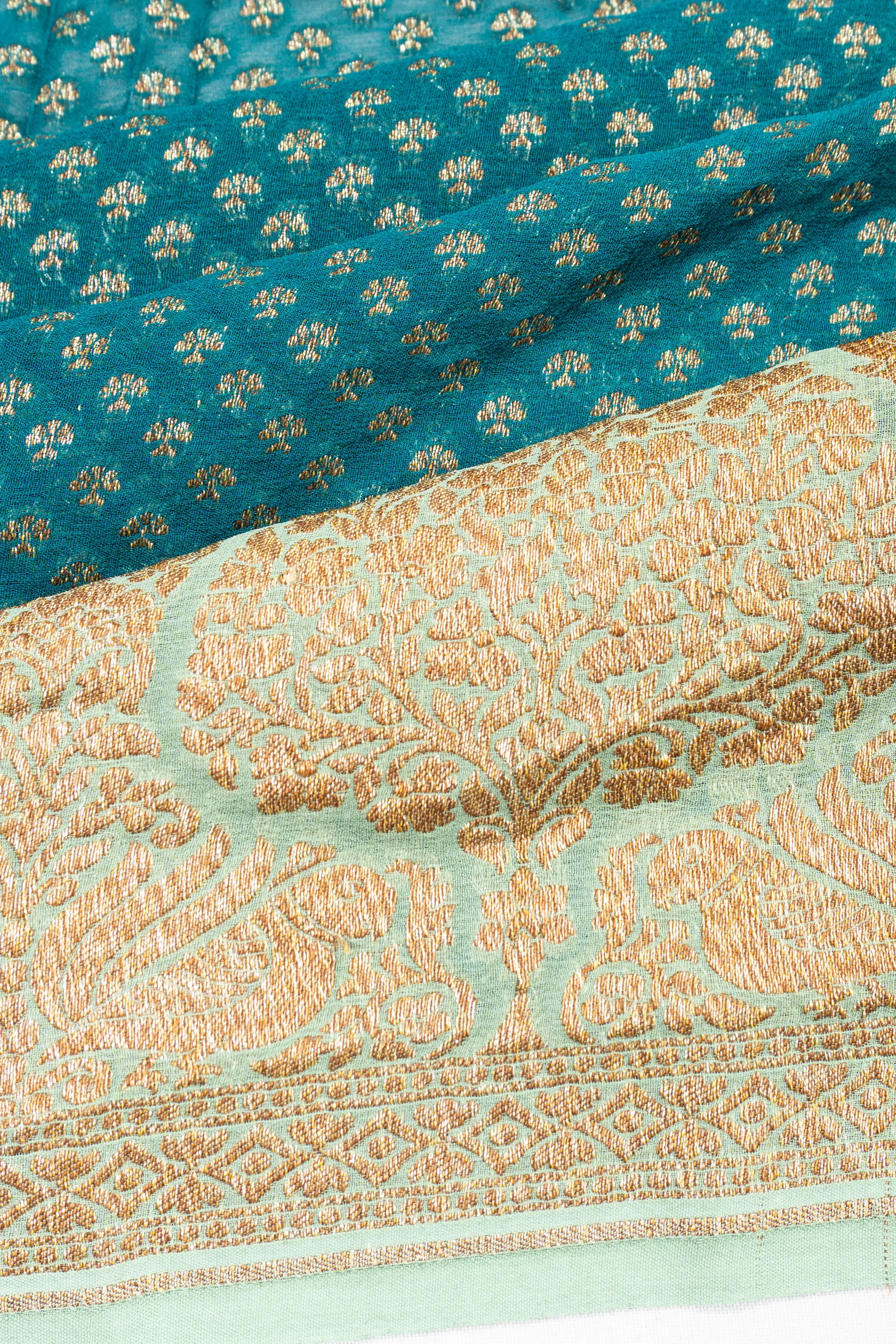 Embrace the allure of tradition with this Banarasi Georgette Brocade Teal Blue Saree, a masterpiece of heritage-rich design The body glows with gold zari floral brocade, reflecting timeless elegance and intricate artistry that captures the essence of cultural luxury