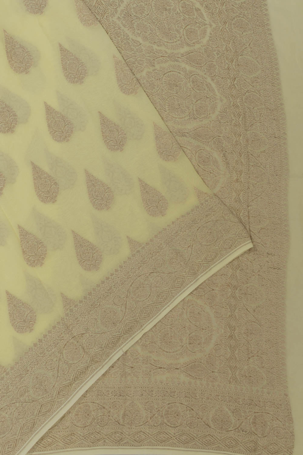 Soft and radiant lemon yellow georgette base adorned with elegant floral buttas, offering a light and graceful drape.