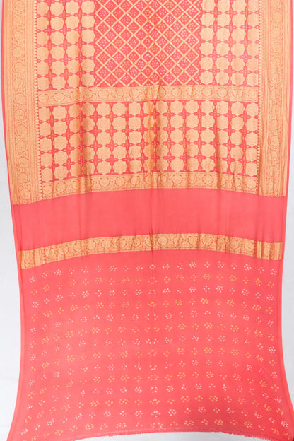 A vibrant red base intricately woven with gold zari criss-cross checks, with traditional Bandhani patterns nestled in between—blending classic weave with timeless craft.
